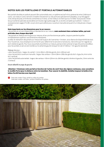 Nos portails doubles en padouk peuvent être automatisés avec un système exclusif né du partenariat entre Collstrop et Came. Les moteurs Came viennent s’installer directement sur des pentures spécialement adaptées, ce qui fait gagner 13 du temps de pose, et limite les contraintes sur le bois, car les moteurs ne tirent que sur le métal. Vous pouvez choisir les quincailleries spéciales seules (elles sont toutes regroupées page 37), ou les kits complets quincaillerie + moteurs + accessoires (voir pages 37 à 39). vLe prix de la quincaillerie pour ouverture manuelle est quant à lui indiqué avec chaque portail.