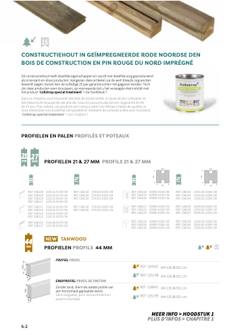Dit constructiehout heeft dezelfde eigenschappen en wordt met dezelfde zorg geproduceerd als onze kant-en-klare producten. Aangezien deze artikelen op de werf dikwijls nog worden bewerkt (zagen, boren) kan de volledige 25 jaar garantie echter niet gegeven worden. Toch zijn deze producten even duurzaam, op voorwaarde dat u het verzaagde vlak instrijkt met het product ‘Collstrop special treatment’ > zie hoofdstuk 7