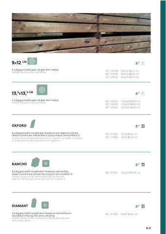 4-zijdig geschaafd met gebroken hoekjes en een afgeschuinde kop, ideaal in combinatie met de Oxford voortuinhekjes (zie hoofdstuk 1). Raboté 4 faces, bords chanfreinés et un chanfrein sur la tête du poteau, à utiliser avec les clôtures Oxford (voir chapitre 1).