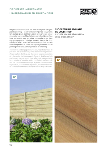 Het gewoon onderdompelen van hout in een groen bad geeft geen bescherming ! Alleen verduurzaming onder vacuümdruk kan resultaat geven. Collstrop beschikt over een eigen erkend drenkstation dat zorgvuldig uitgekozen grenenhout (grenenhout is de basisvereiste voor een diepe impregnatie) onder hoge druk impregneert tot “volledige saturatie”, dwz tot het hout volledig verzadigd is van het verduurzamingproduct en niets meer kan opnemen. Dit proces is computergestuurd en al onze geïmpregneerde producten dragen de ctb b+ erkenning.