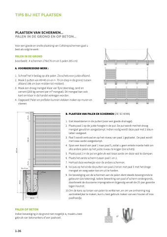 9. De bevestiging van de schermen aan de palen dient steeds bovengronds te gebeuren (zie tekening). Iedere bewerking van paal of scherm ondergronds, doorbreekt de duurzame impregnatie en bijgevolg vervalt de 25-jaar garantie tegen houtrot.