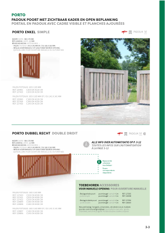 Manueel beslag : hengsels, scharnieren, cilinderslot, kruk. Dubbele poorten ook inclusief grondplaat. Quincaillerie manuelle : gonds, charnières, serrure et poignée. Portails doubles: butée comprise.