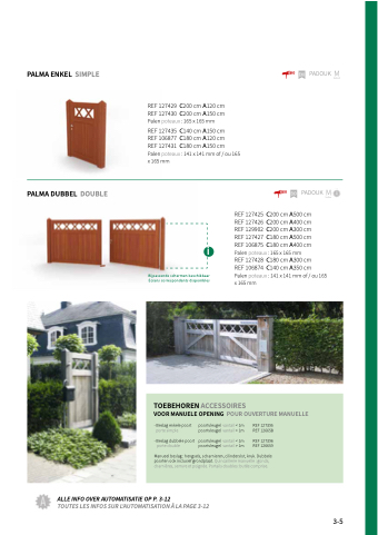 Manueel beslag : hengsels, scharnieren, cilinderslot, kruk. Dubbele poorten ook inclusief grondplaat. Quincaillerie manuelle : gonds, charnières, serrure et poignée. Portails doubles: butée comprise.