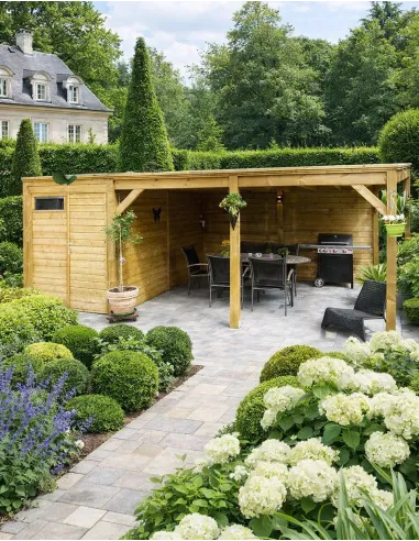Fabriqué en Sapin Rouge du Nord, ce chalet de jardin bénéficie d'un traitement par imprégnation en autoclave vert de classe 4 (C4 !). Ce procédé lui confère une résistance exceptionnelle face aux intempéries, aux insectes et aux champignons, garantissant ainsi une longévité maximale sans entretien contraignant. Côté toiture, l'abri est livré avec une bâche EPDM de haute qualité pour une étanchéité parfaite, ainsi qu'une gouttière pour faciliter l'évacuation des eaux pluviales.