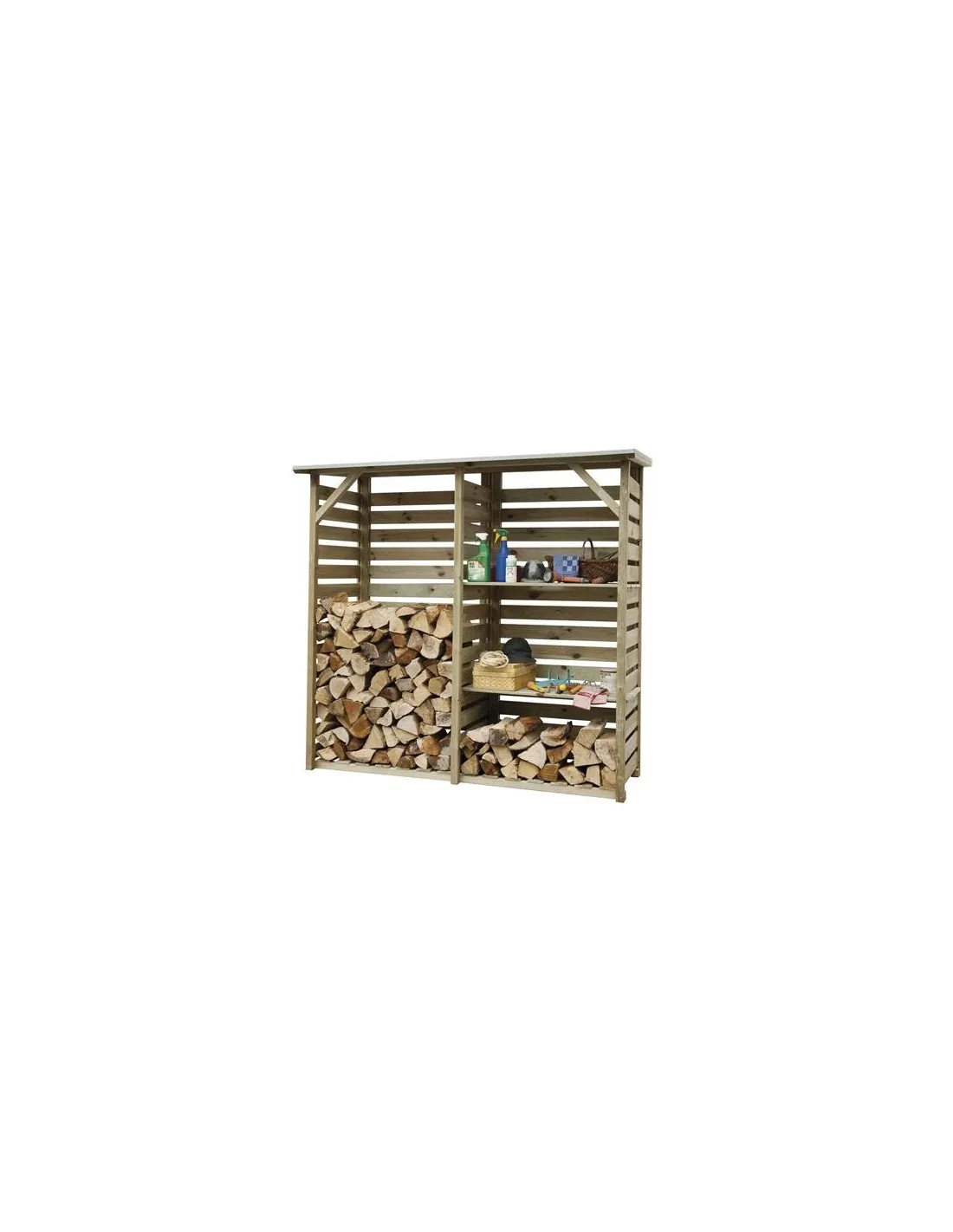Abri bûches en latte de bois ajourés pour entreposer 2 m³ de bois de chauffage, l’abri est en pin traité résistant aux intempéries.