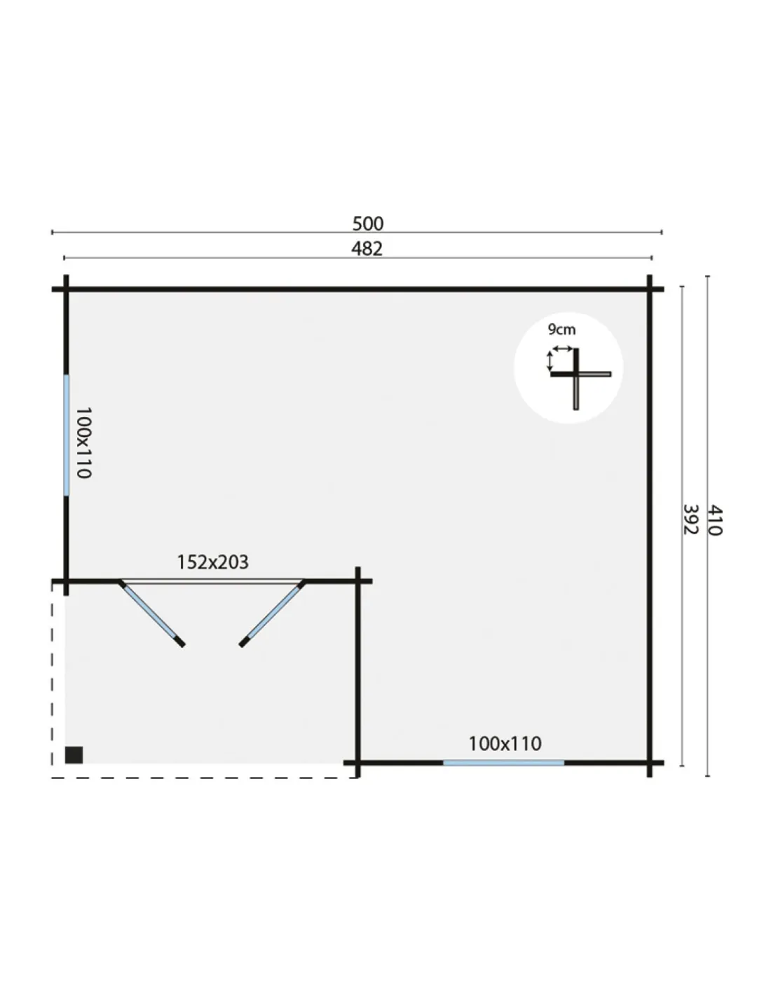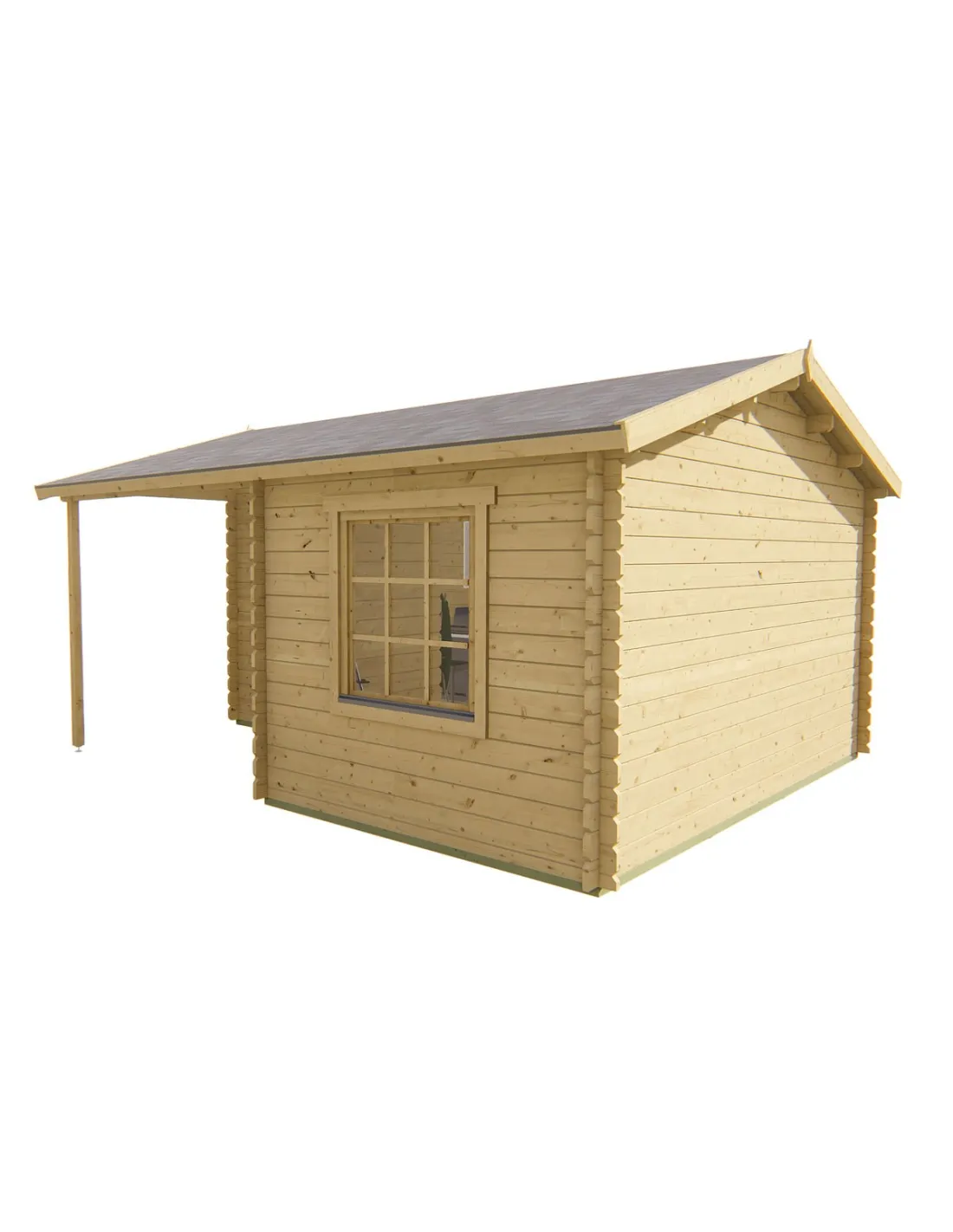 L'abri de jardin et son auvent ont une dimension de 500 x 410 cm. Les planches ont 34 mm d'épaisseur.