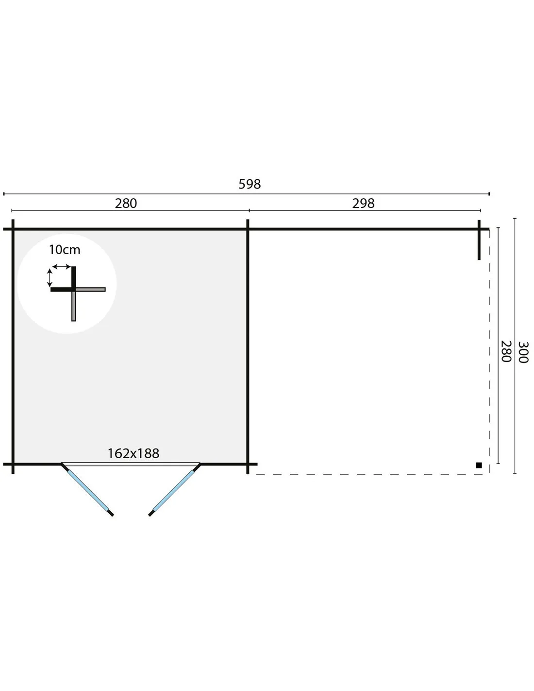 • Un espace fermé de 280 x 280 cm, équipé d’une élégante double porte vitrée en verre simple, parfait pour stocker outils, vélos ou mobilier de jardin à l’abri des intempéries.