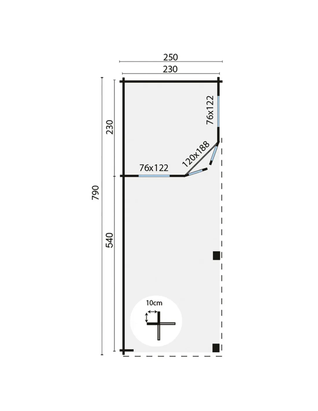 Épaisseur des parois : 44 mm (emboîtement de 10 cm aux angles)