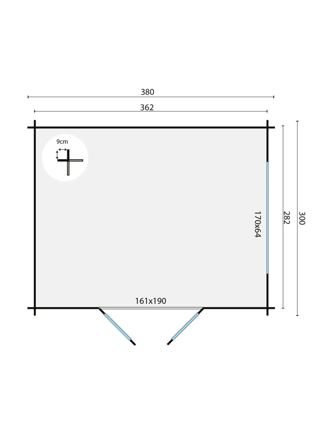 • Dimensions extérieures : 380 x 300 cm