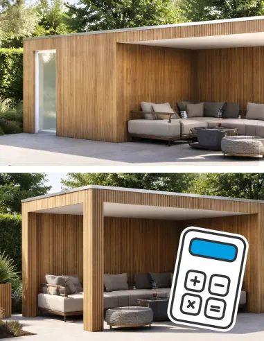 La toiture est un toit plat avec une légère pente, recouvert d’une membrane EPDM posée sur un plancher de toit traité de 16 mm (non prémonté). Il n’y a pas de latte de finition. L’abri est sans avancée, mais dispose d’un profilé aluminium tout autour d’environ ± 4,5 cm.