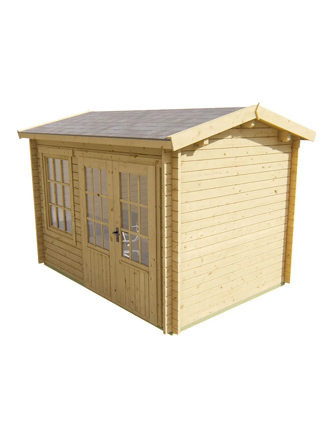Ce chalet de jardin en bois est équipé d'une grande double porte vitrée et d'une fenêtre ouvrante avec double vitrage, laissant entrer un maximum de lumière naturelle tout en garantissant une bonne isolation thermique.