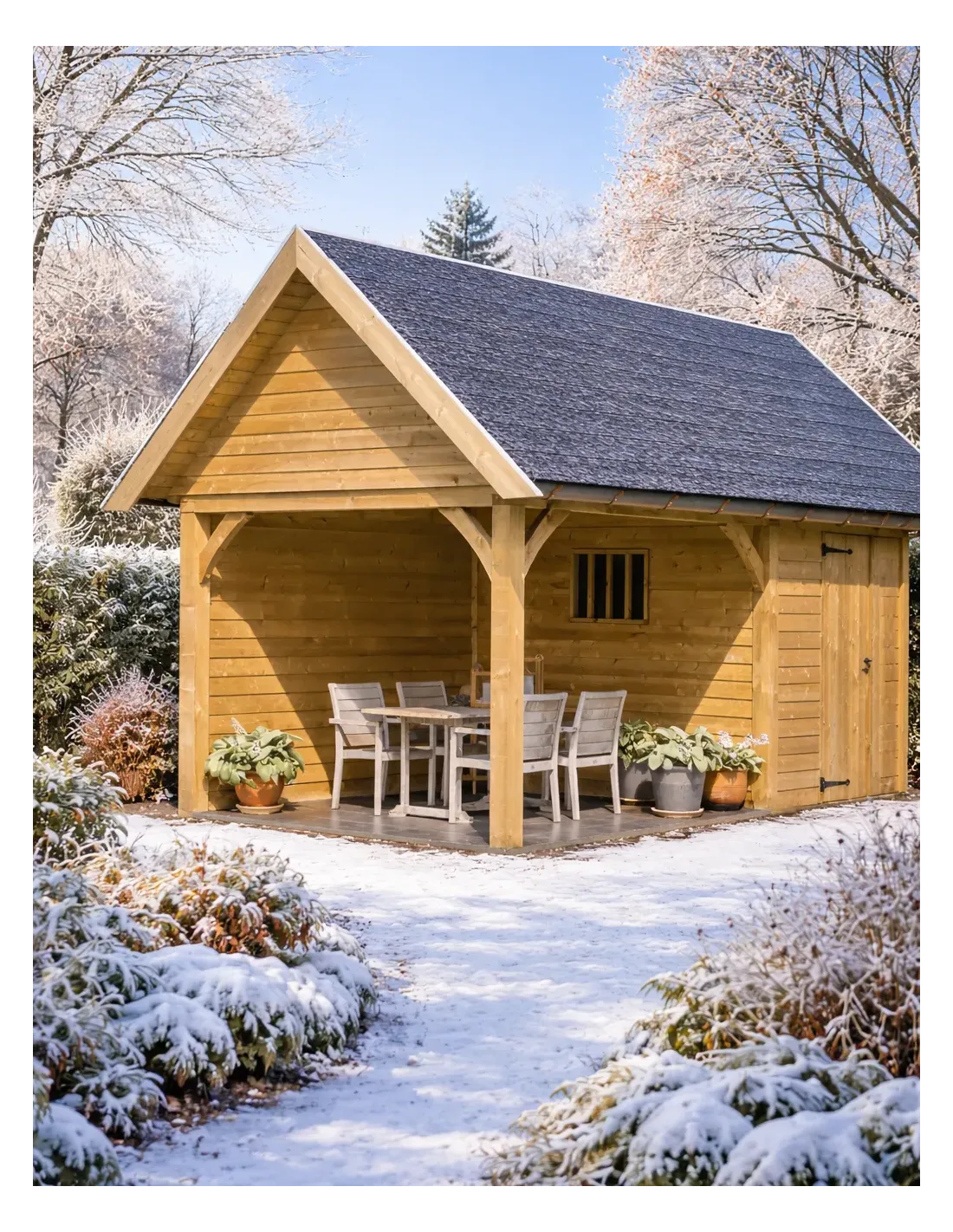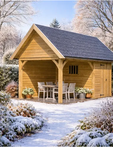 Conçu en Sapin Rouge du Nord, cet abri garantit une longévité exceptionnelle. Ses parois épaisses assurent une excellente stabilité structurelle. La toiture en shingles offre une étanchéité parfaite et une finition esthétique haut de gamme, disponible en plusieurs coloris pour s'harmoniser avec votre maison.