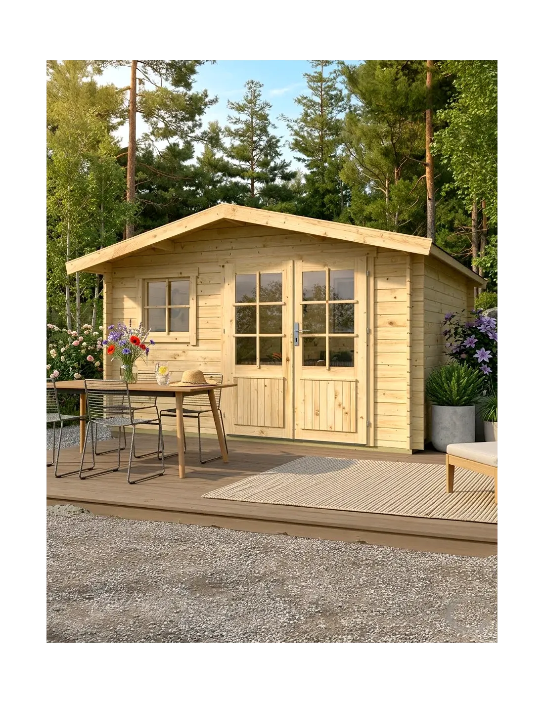 Fabriqué avec des madriers de 28 mm d'épaisseur, l'abri Veltem offre une excellente stabilité structurelle. Le bois est raboté et séché, garantissant une finition lisse et une meilleure résistance aux déformations dans le temps. Avec une surface intérieure de 11,4 m², vous disposez d'un volume généreux de 22,8 m³ pour organiser votre matériel de jardinage, vos vélos ou créer un espace de loisirs.