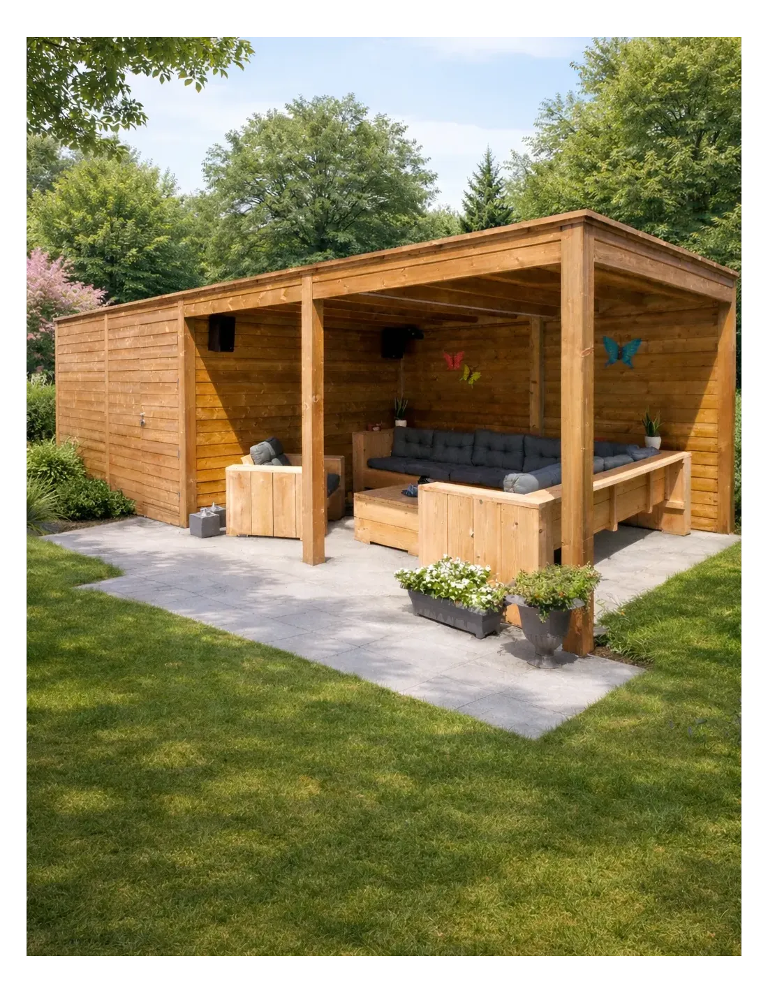Découvrez notre abri tonnelle au design moderne de la gamme Cubo Premium. Avec ses dimensions généreuses de 8,94 m de largeur sur 3,18 m de profondeur, cet aménagement extérieur est idéal pour créer un espace de vie convivial, une cuisine d'été ou un grand salon de jardin abrité.