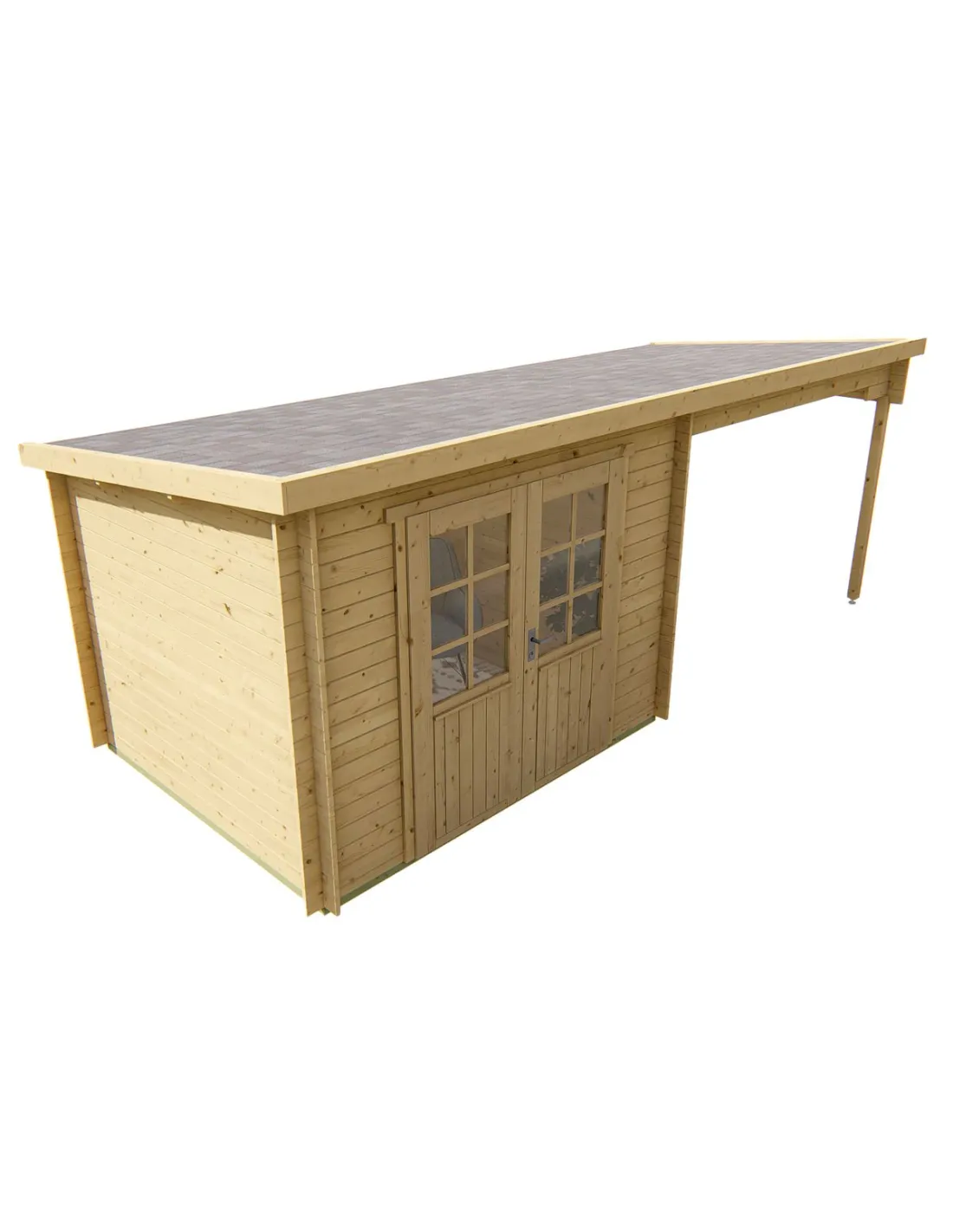 Offrez à votre extérieur une solution de rangement moderne et fonctionnelle avec cet abri de jardin à toit plat en bois. Ce modèle se compose d’un espace de rangement fermé (2,80 m x 2,30 m) équipé d’une double porte vitrée, et d’un auvent latéral abrité (2,98 m x 2,30 m), idéal pour stocker du matériel, abriter un salon de jardin ou créer un espace détente protégé des intempéries.