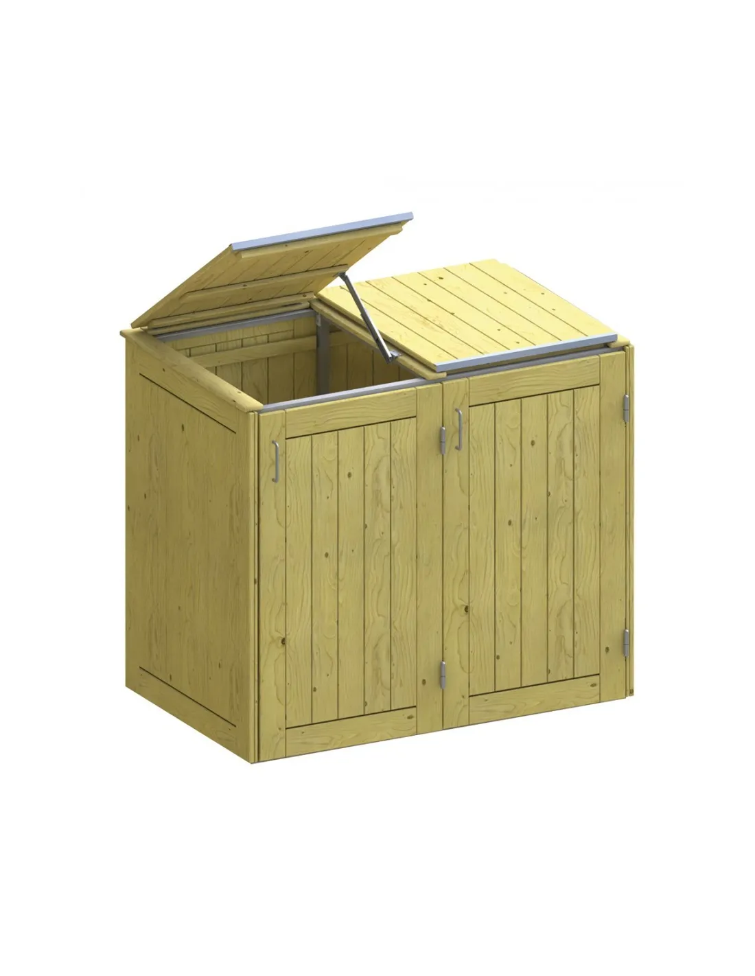 Disponibles avec (150 x 90 x 129 cm) ou sans bac à plantes (139 x 84 x 125 cm). Tous les caches poubelle disposent de couvercle muni d'une charnière télescopique et du tirant (sans bac), d'un maintien de box réglable et d'un guide roue. Les portes en inox sont renforcées à l'intérieur. Fabriqués en matériaux variés : HPL (ardoise ou gris), inox, bois SRN imprégné, bois exotique FSC.
