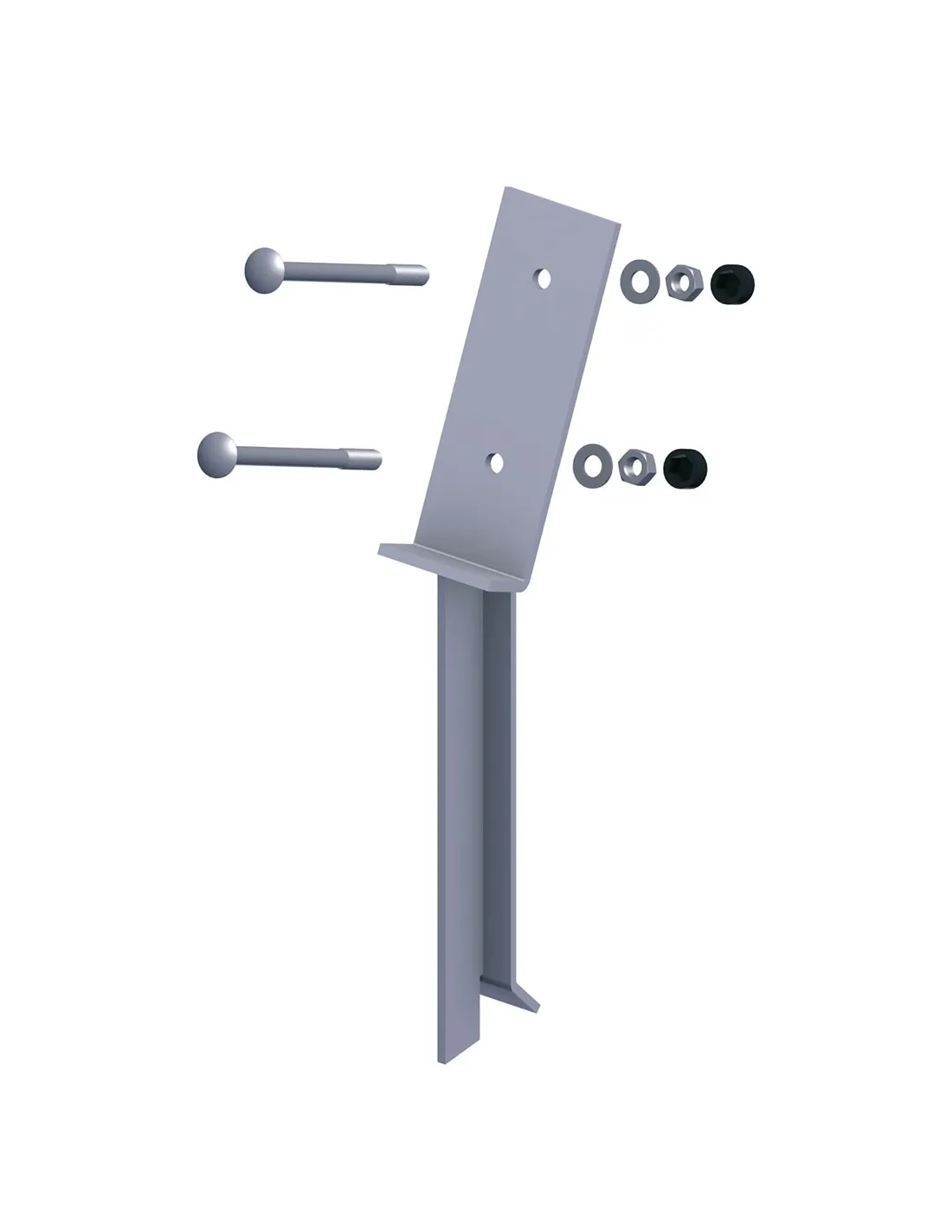 L’ancrage au sol est en acier galvanisé de 6mm d’épaisseur. Il est conçu pour l’ancrage au sol du support en forme de A et doit être scellé. Pour chaque support en A prévoyez 2 ancrages.