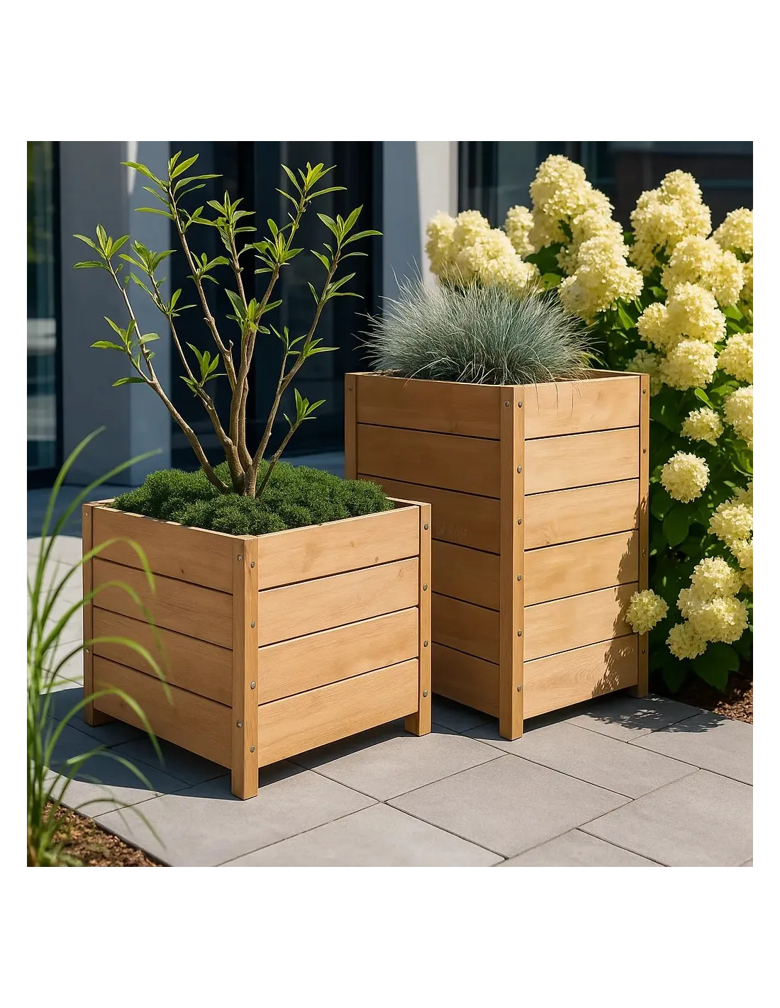 Bac à fleur en bois exotique pour une jolie terrasse. Ils sont de formes carrées utile pour vos arbustes, petites plantations, fleurs ou petit potager.