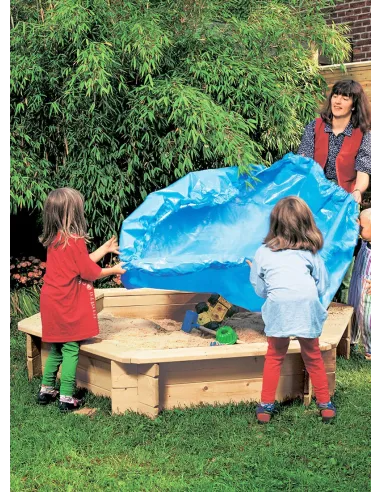 La bâche en polyéthylène bleu protège le bac à sable des salissures. La bande élastique solide permet une fermeture facile.