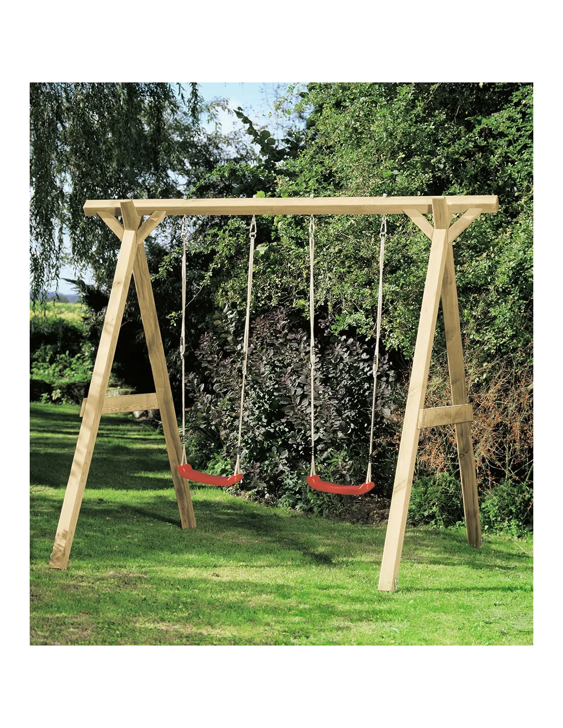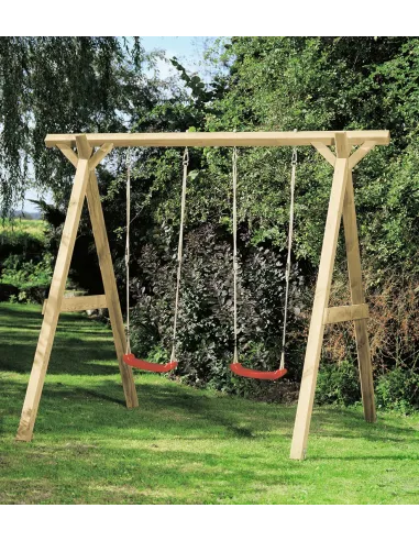 La double balançoire en bois résineux massif certifié FSC® est un kit complet incluant deux balançoires en matière plastique. La poutre de portique stable est tournée à 45° lors de sa pose pour obtenir l’angle maximum (12 cm) de ce bois carré. Pour l’ancrage au sol, prévoir 4 ancrages supplémentaires pour support en forme de A (réf. 1724).
