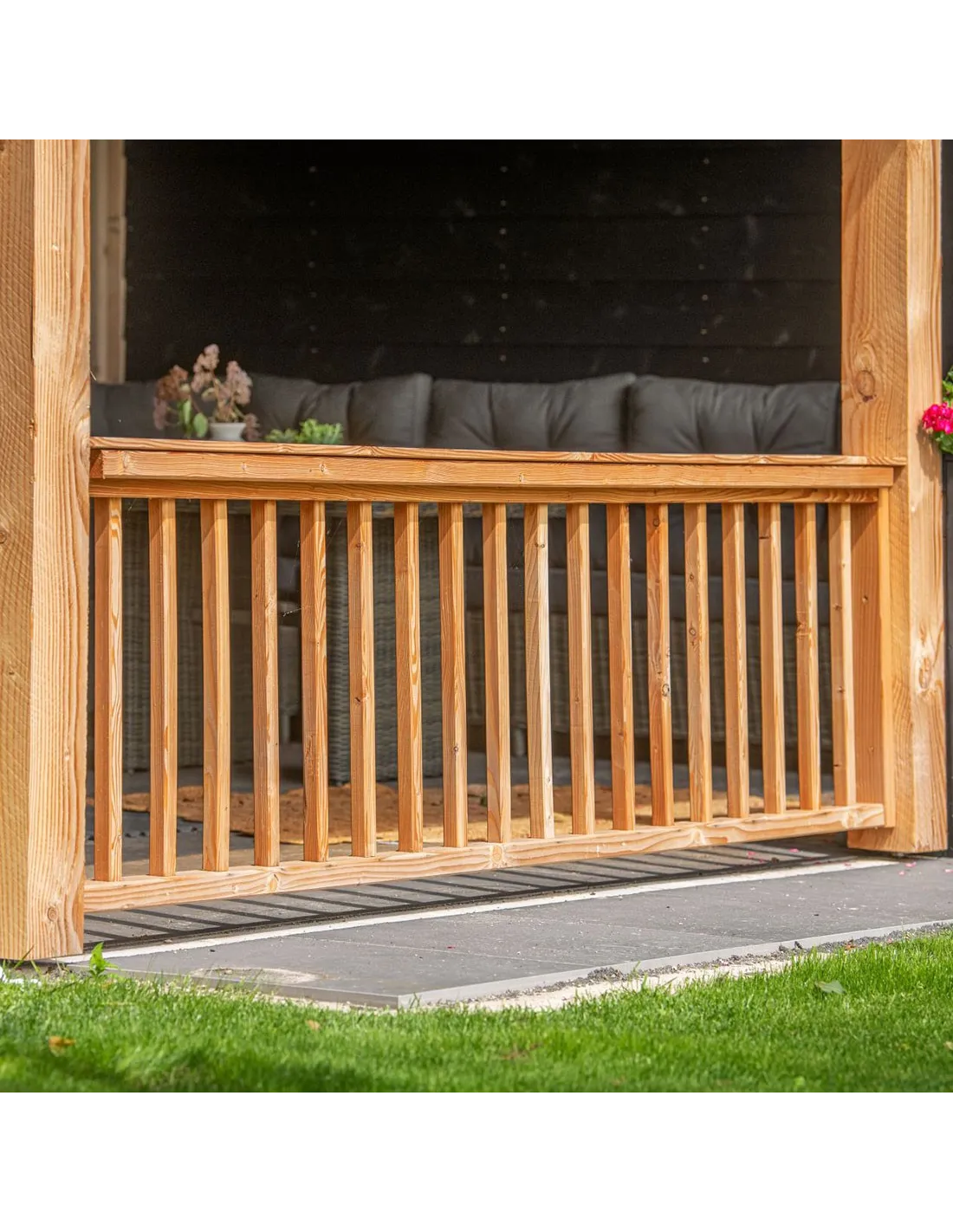 Balustrade de jardin en bois de Douglas. D'une largeur de 180 cm sur une hauteur de 99 cm.