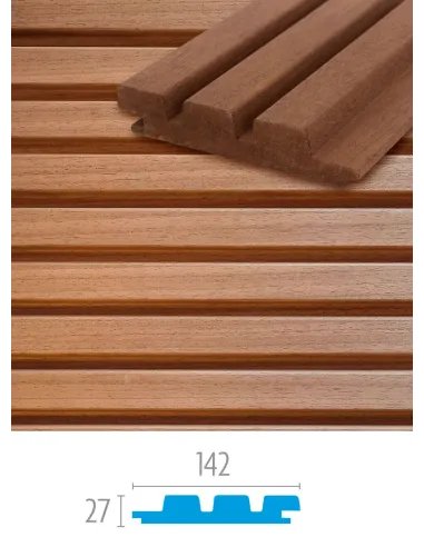 Planches de bardage en Ayous avec profil triple (27x142 mm).