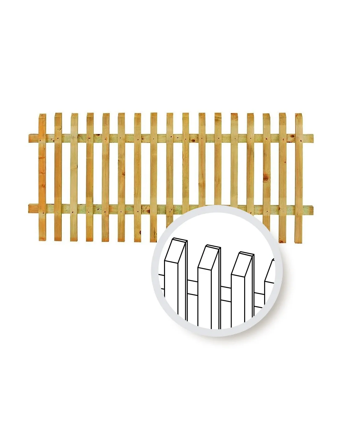 Barrière jardin Woluwe en pin traité autoclave, 180 cm large, hauteur 80, 100 ou 120 cm. Lattes biseautées, robuste et résistante. S'associe au portillon Woluwe de la même gamme.