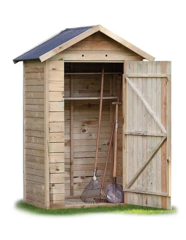 Cabane de rangement outils en bois à mettre dans le jardin. La largeur est de 127 cm sur une hauteur de 214 cm et une profondeur de 80 cm.