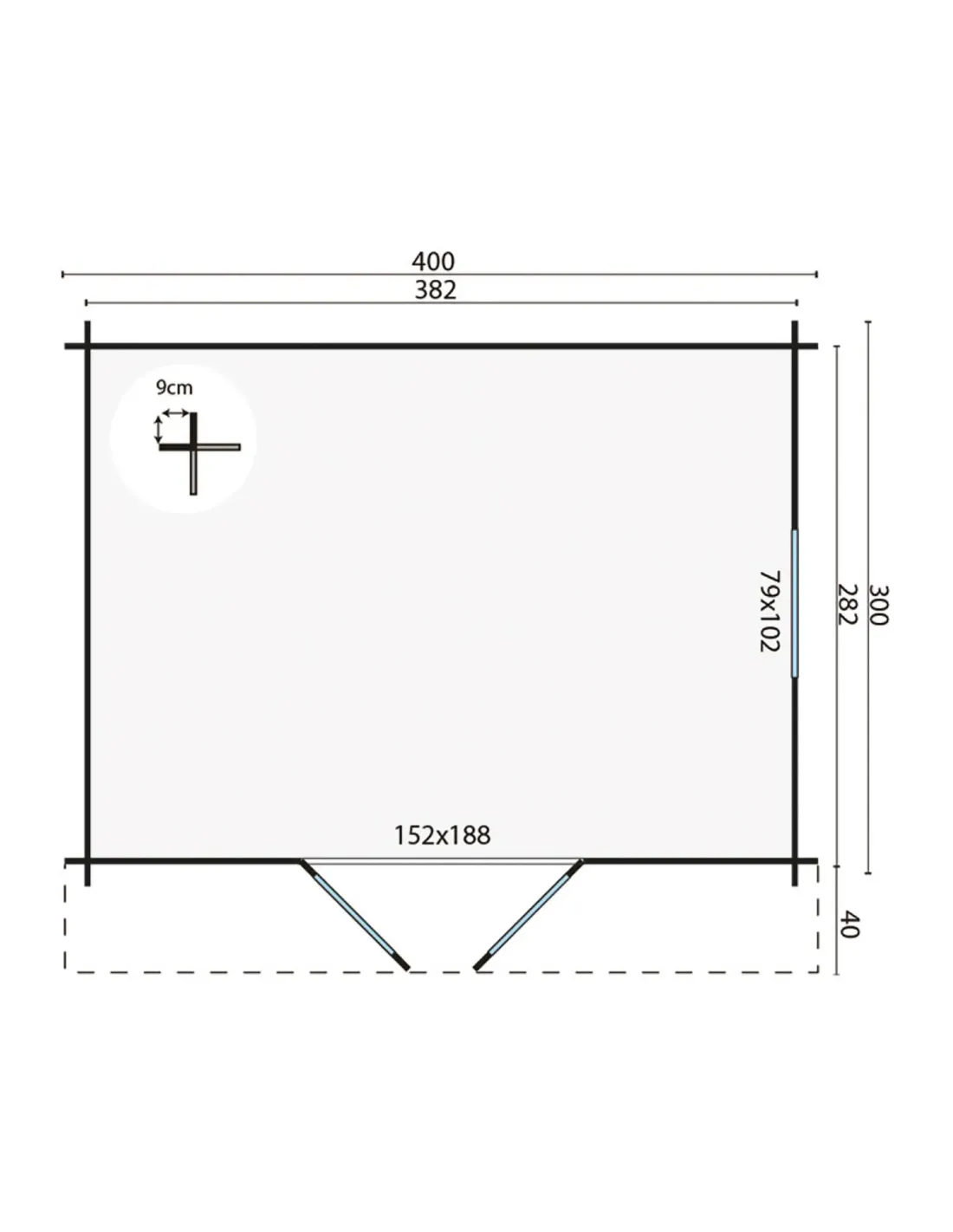 • Dimensions extérieures : 400 x 300 cm