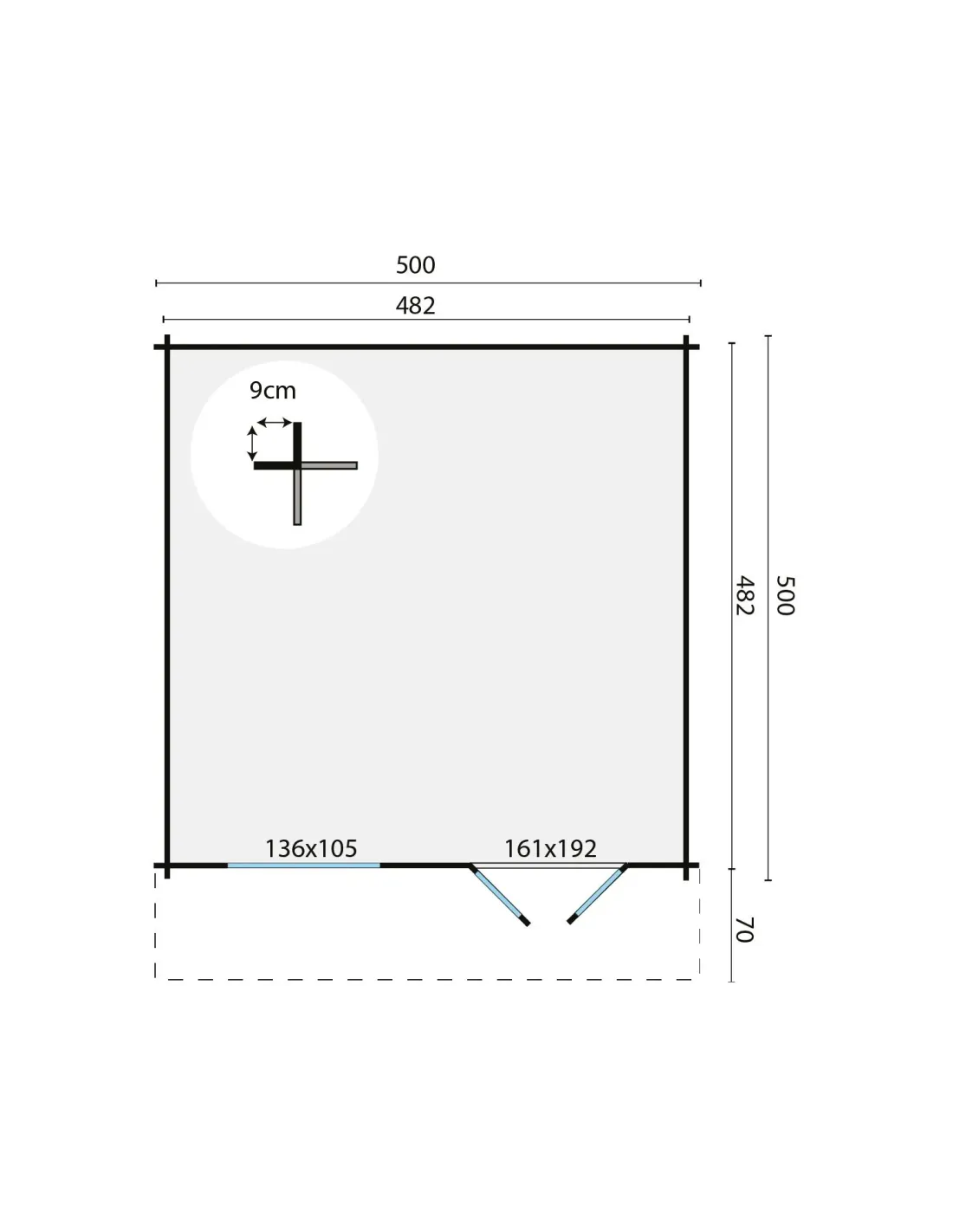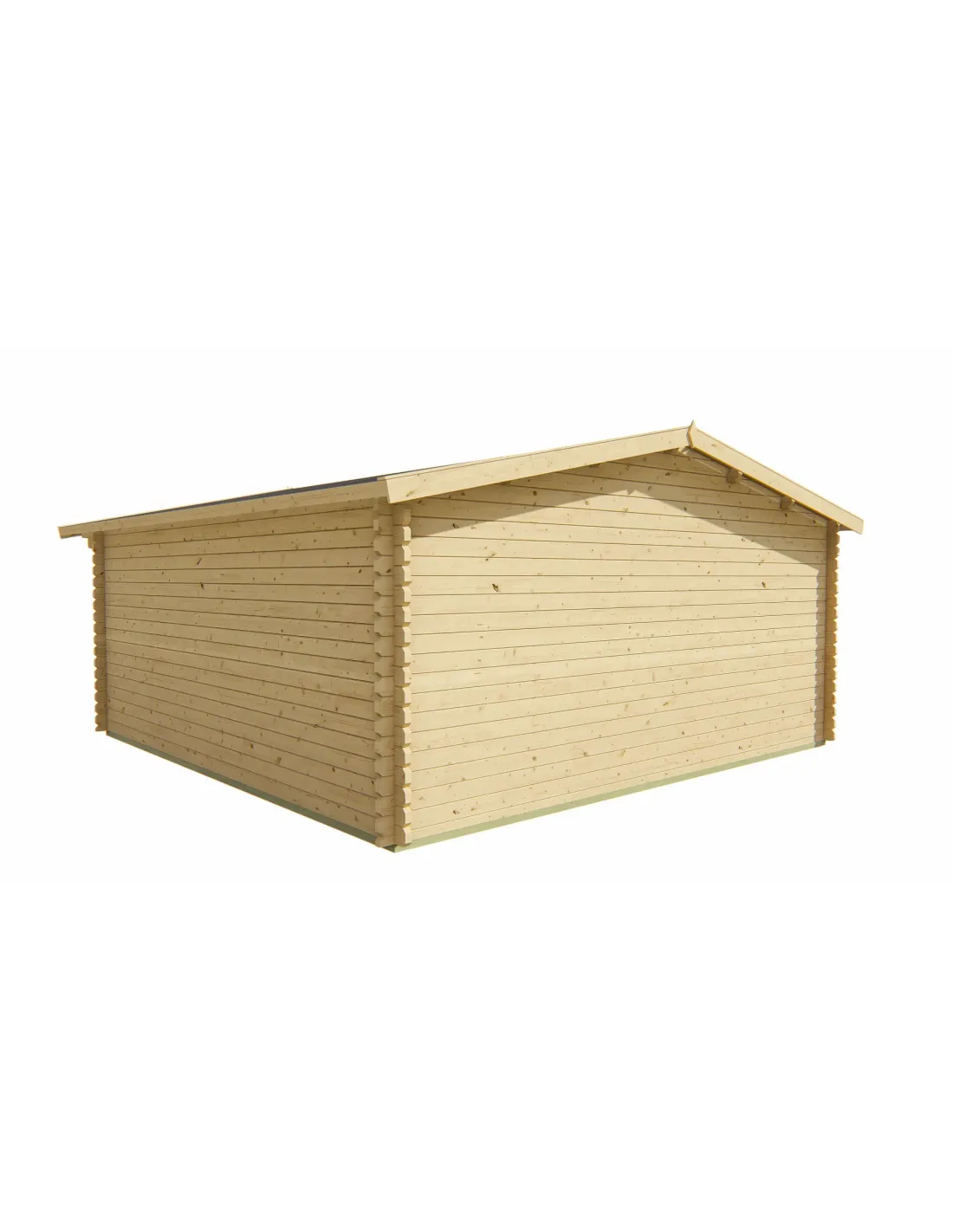 Chalet de jardin 5 x 5 m en bois d’épicéa imprégné ou non, séché et raboté, avec parois de 44 mm pour une excellente stabilité et isolation naturelle. Toit double pente (Apex) incliné à 28°, couverture en option, avec auvent frontal intégré. Équipé d’une double porte vitrée avec vitrage isolant 3-9-3 mm, verrouillage à cylindre, 1 fenêtre ouvrante et barreaux géorgiens amovibles. Portes et fenêtres positionnables à gauche ou à droite. Dimensions extérieures : 500 x 500 cm. Surface intérieure : 22,4 m². Volume : 50 m³. Hauteur : 250 cm. Fondation recommandée : 482 x 482 cm. Surface de toiture : 30,4 m².