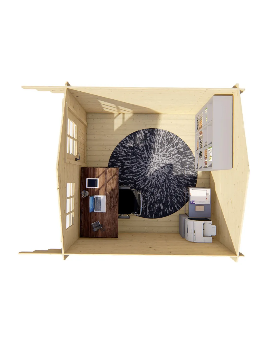 Petit et simple chalet ou abri de jardin de style "Opwijk" de format carré de 3 x 3 m. Composé d'une simple porte vitrée et d'une fenêtre.