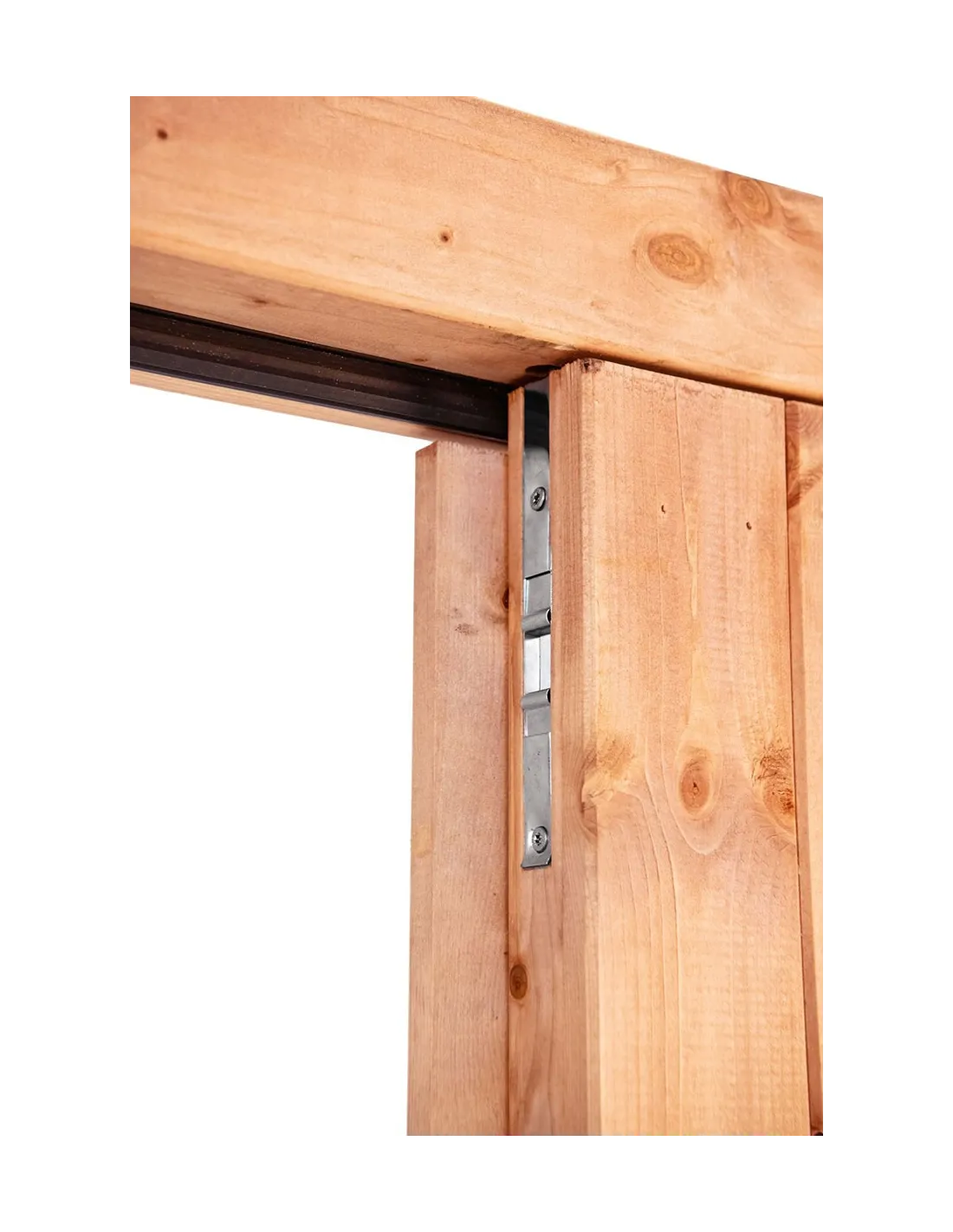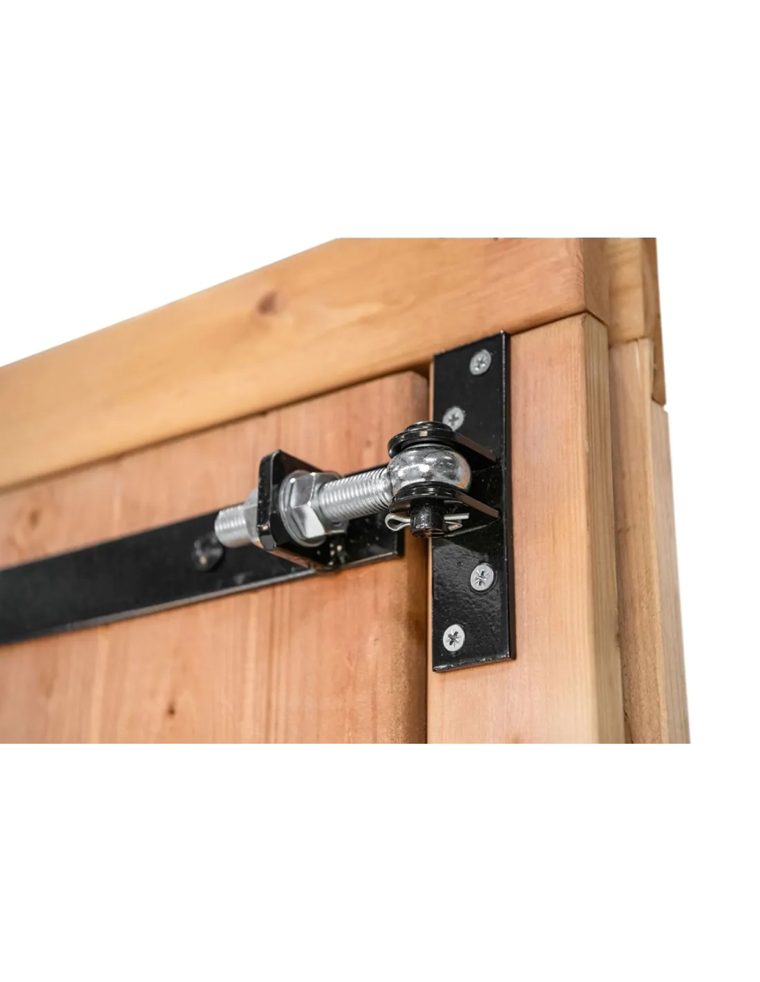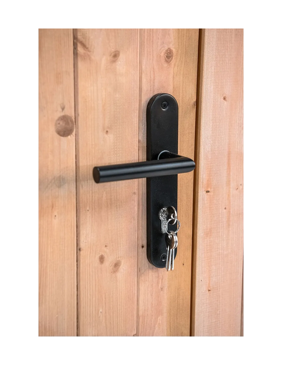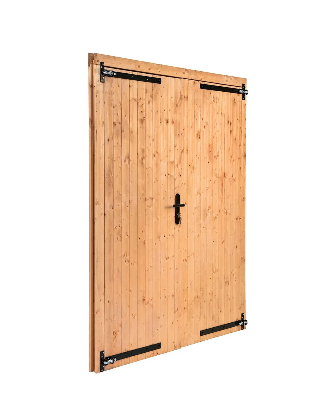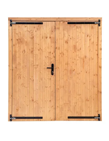 Porte double pour abri de jardin pleine ou avec vitres. Elle est fournie avec son cadre, ferrure de porte et serrure à cylindre. La largeur de la porte est de 180 cm sur une hauteur de 201 cm.