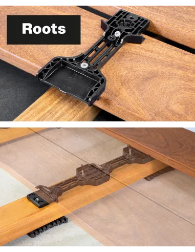 Le système de fixation invisible Roots apporte une véritable innovation dans le domaine des fixations invisibles pour terrasses en bois. La fixation Roots se pose sur le dessous des lames de terrasse standards, sans profil spécifique.