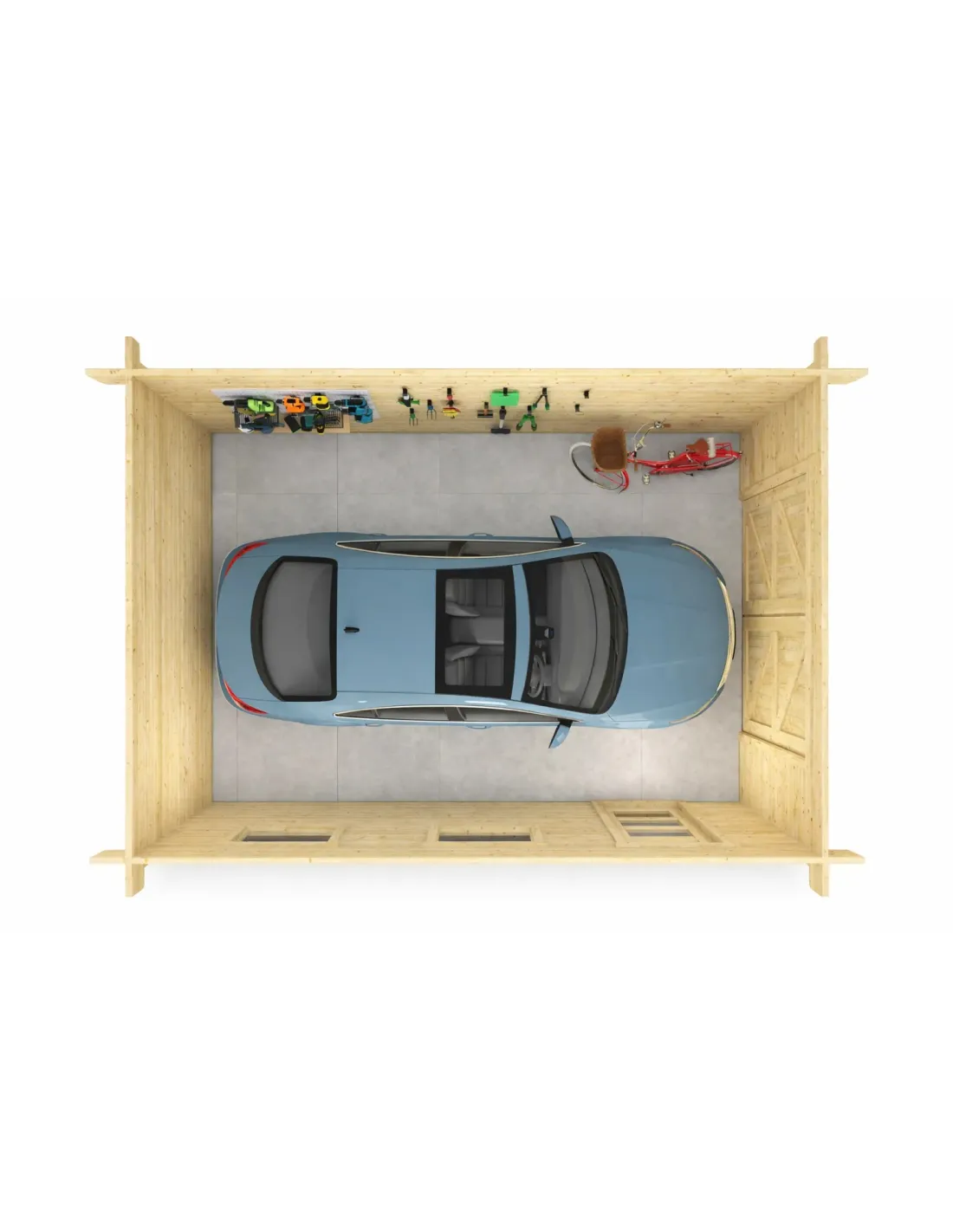 Ce garage est fabriqué en bois d’épicéa traité ou non, laissant la liberté de choisir la finition ou le traitement de protection selon vos préférences (lasure, peinture, protection UV). La finition rabotée offre un rendu soigné et contemporain.