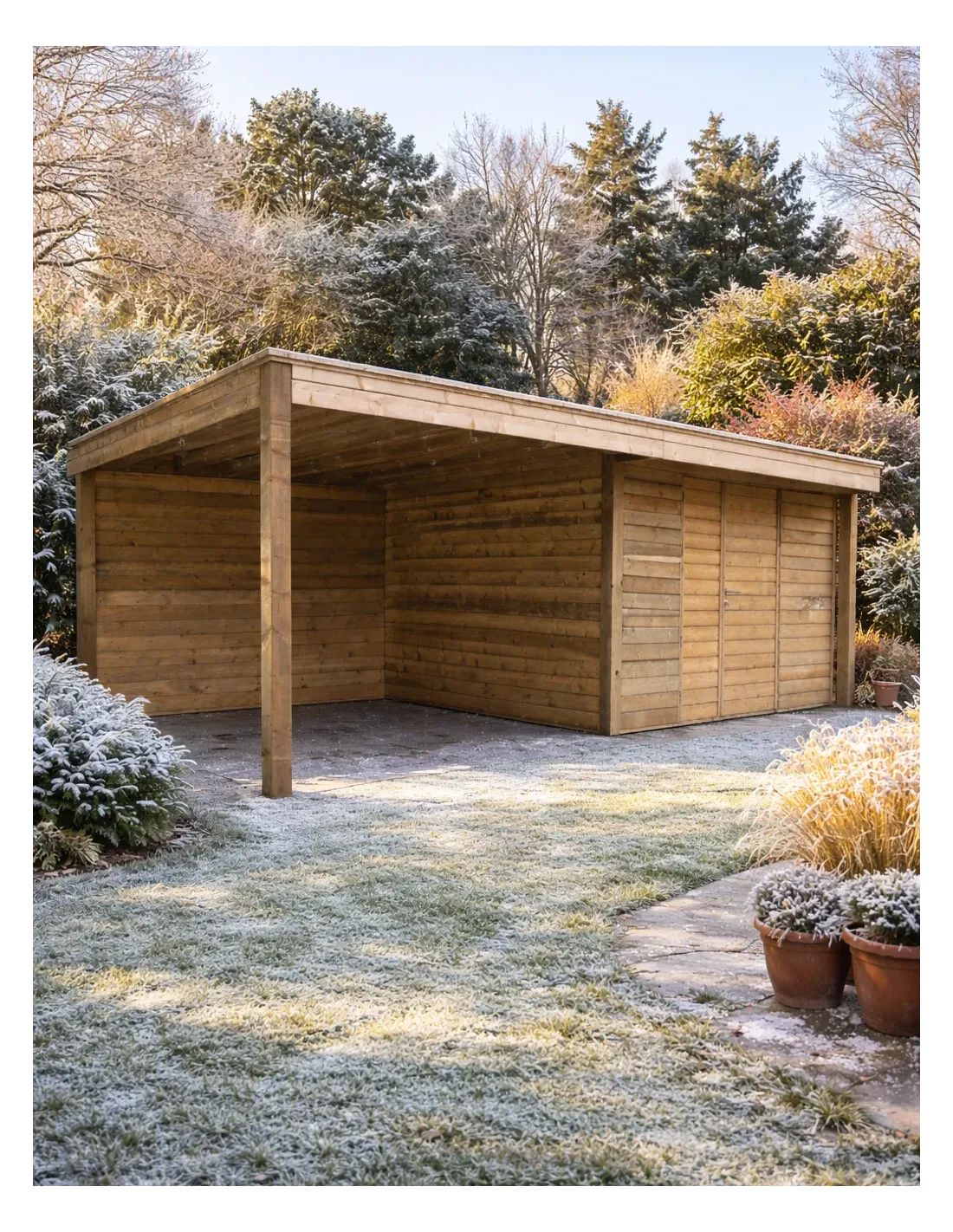 Type de produit : Maison / Abri de jardin avec terrasse couverte intégrée (design à lattes horizontales)