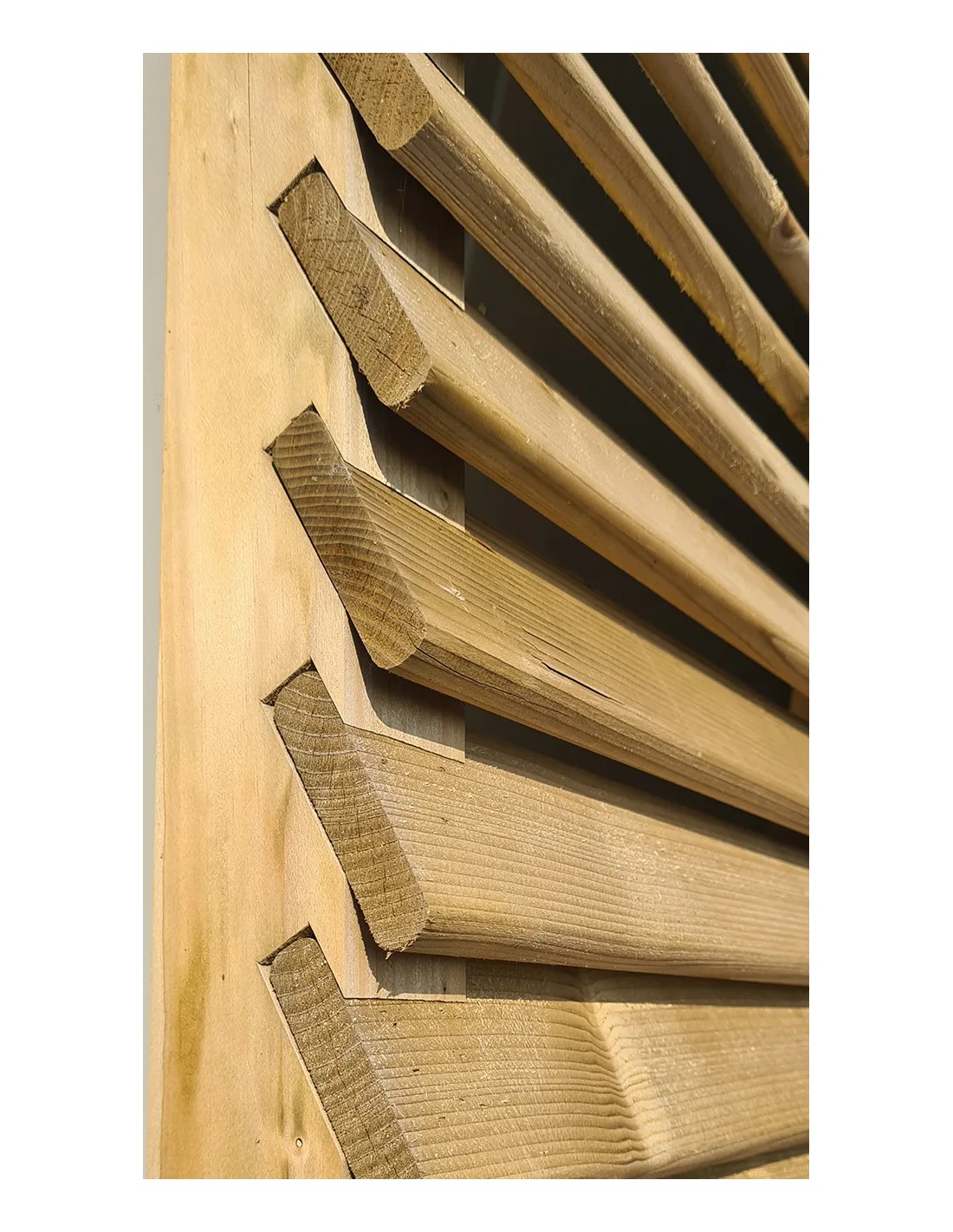 Le treillage typé persienne de la gamme lattes inclinées est comme un volet et est proposé en lames à la française de pin 17 x 75 mm pour une largeur de 180 cm et une hauteur possible : 180 cm.