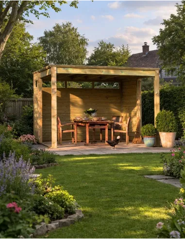 Une conception en bois de haute qualité et durable Ce pavillon est fabriqué en Sapin Rouge du Nord, une essence de bois reconnue pour sa robustesse. Pour vous garantir une longévité exceptionnelle et un entretien réduit, le bois a subi un traitement par imprégnation en autoclave vert de Classe 4 (C4). Il est ainsi parfaitement protégé contre l'humidité, la pourriture, les champignons et les attaques d'insectes xylophages, même en contact permanent avec les intempéries. Sa stabilité est assurée par 4 poteaux massifs de 12 x 12 cm.