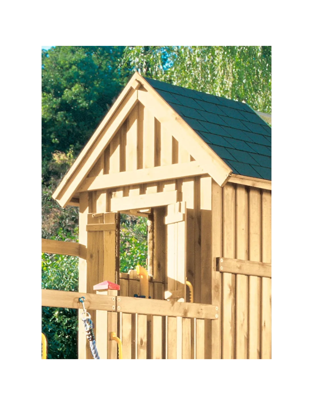 Les frontons (pignons de toit) pour tour de portique sont compatibles sous tous les toits de la tour de jeux - le toit bleu en toile PE, le toit en bois et sous le toit vert facile à entretenir.
