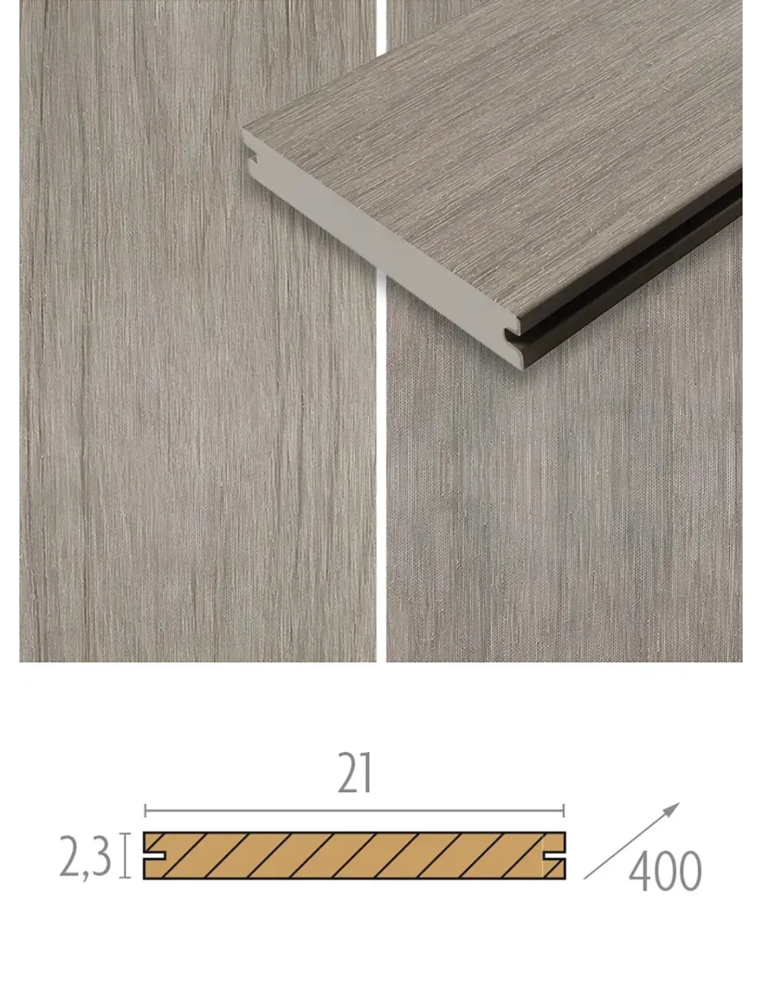 Les planches de terrasse Multigrey Light sont conçues pour apporter une élégance naturelle à votre jardin ou balcon. Mesurant 2,3 cm d'épaisseur et 21 cm de largeur avec une longueur de 4 mètres, elles offrent une installation robuste et fiable. Leur couleur grise légèrement boisée ajoute une touche de modernité et d'élégance naturelle, s'intégrant parfaitement à diverses conceptions extérieures.