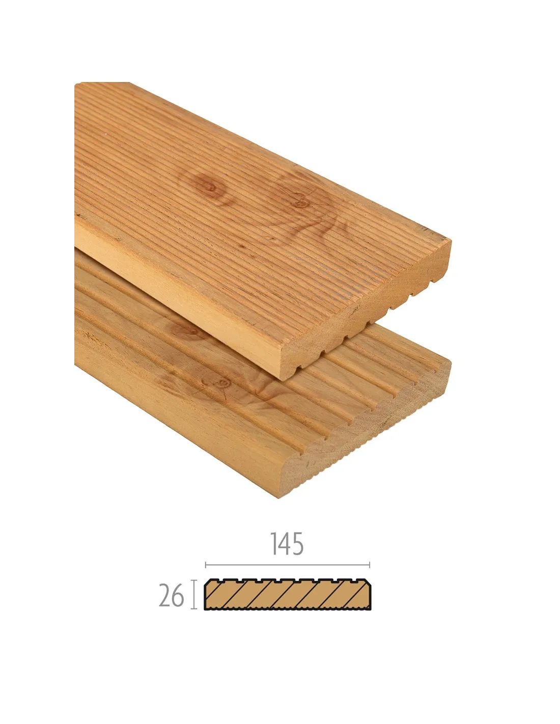 Les planches de terrasse en Mélèze Européen, de 14,5 cm de large sur 2,6 cm d'épaisseur, combinent esthétique et durabilité grâce à leurs rainures antidérapantes. Faciles à installer, elles résistent bien aux aléas climatiques sans nécessiter de traitement chimique grâce à la résistance naturelle du Mélèze contre la pourriture et les insectes. Choisies pour leur côté éco-responsable, ces planches assurent un extérieur élégant et durable.