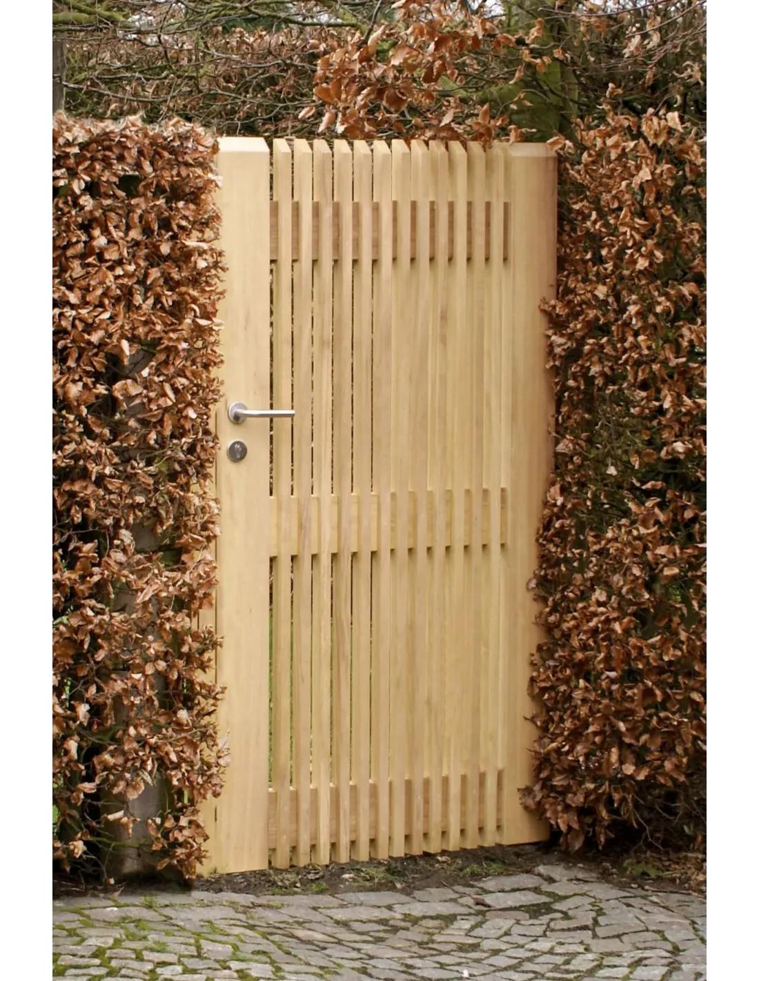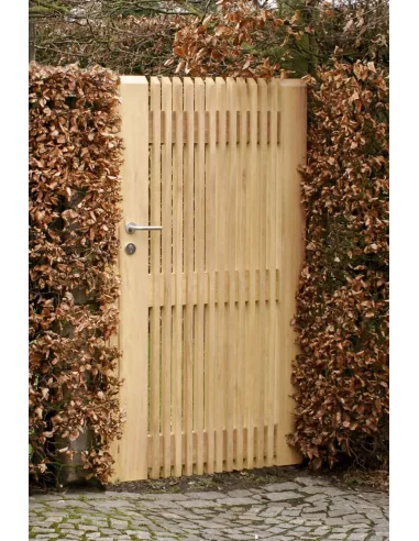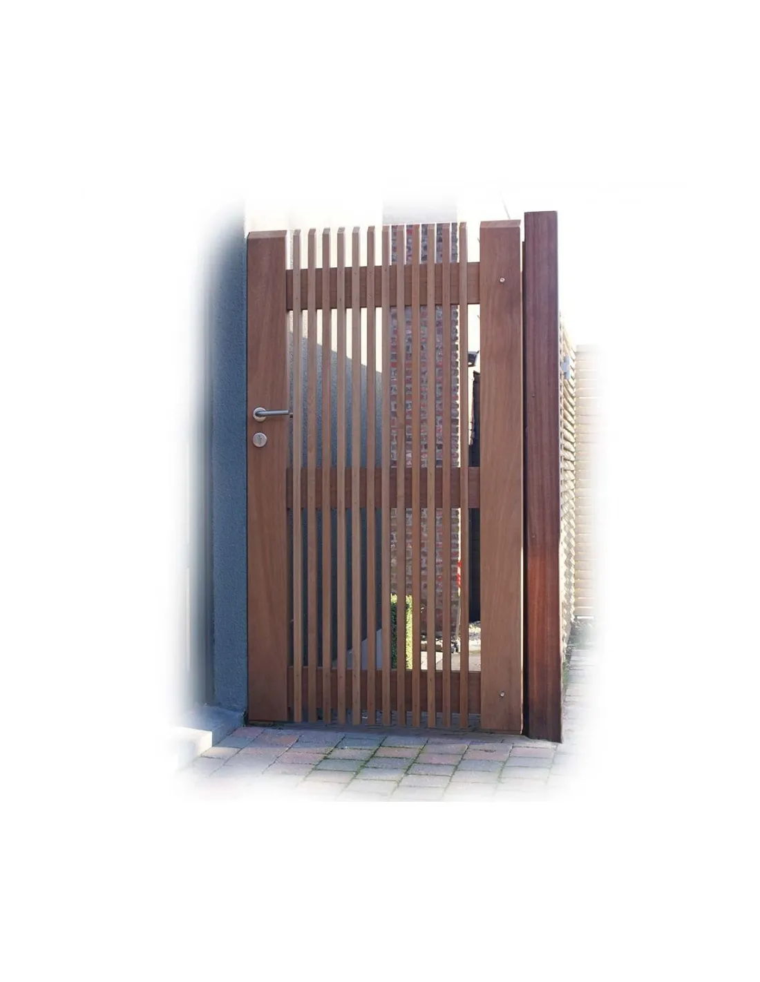 Porte et portail de jardin ajourés en bois exotique. Son design est moderne.