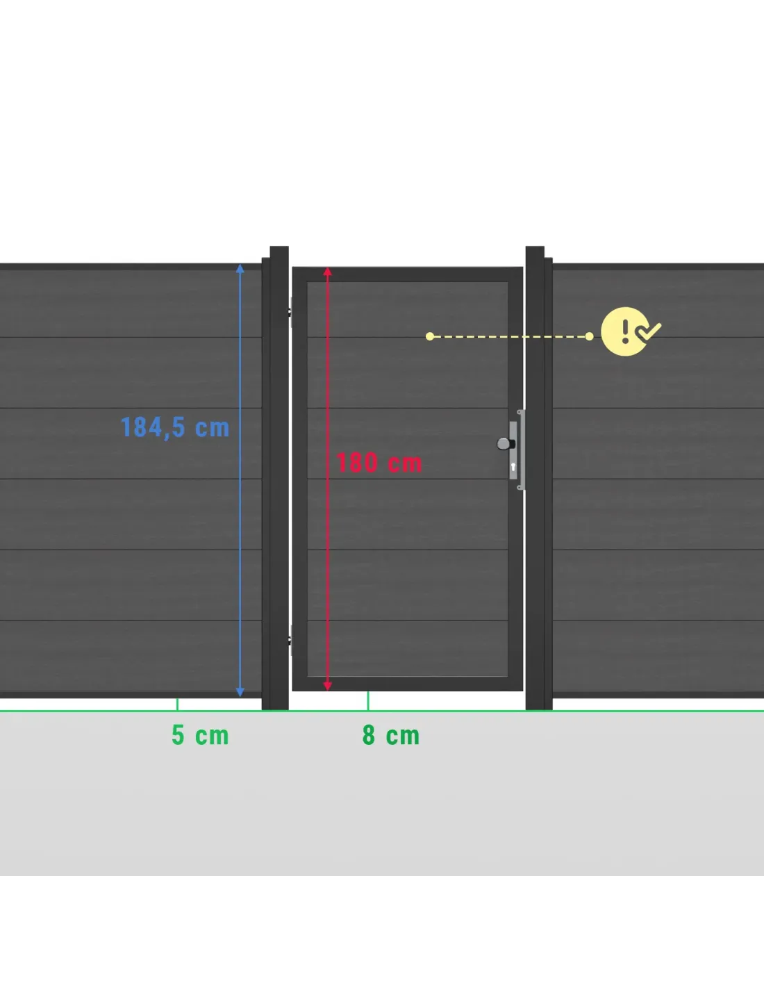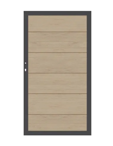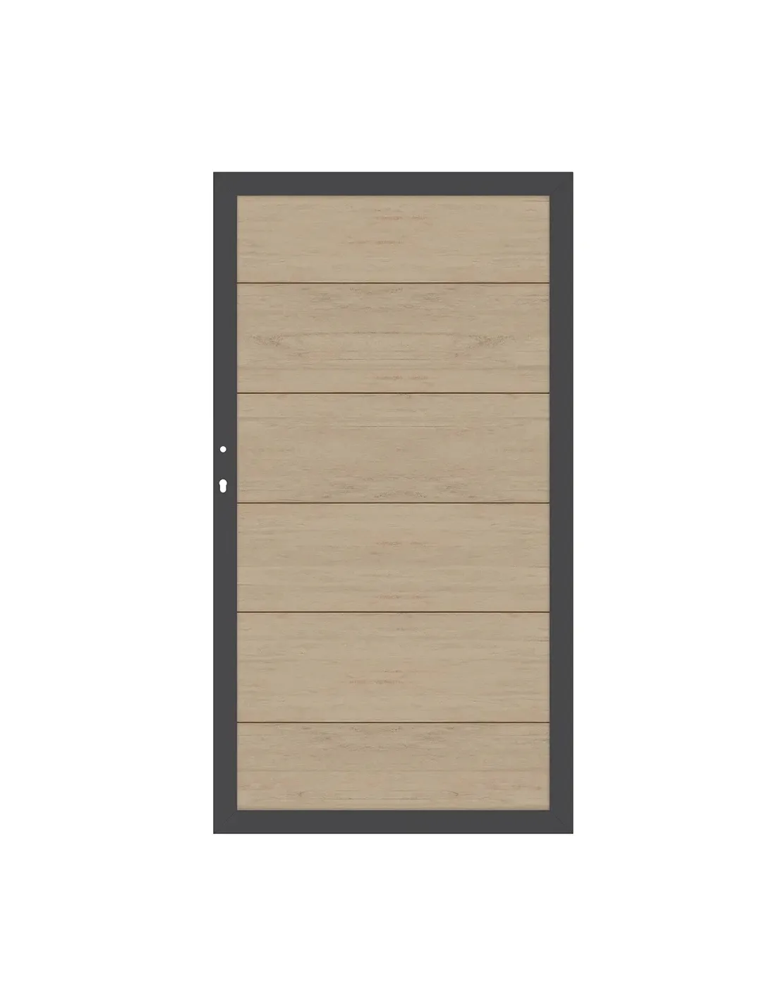 Améliorez l'entrée de votre jardin avec notre porte en bois composite XL de haute qualité, doté de 6 lames robustes encadrées d'un solide cadre en métal pour une durabilité exceptionnelle. Grâce à des équerres en acier discrètement intégrées dans les coins, ce portail assure une stabilité sans égale.