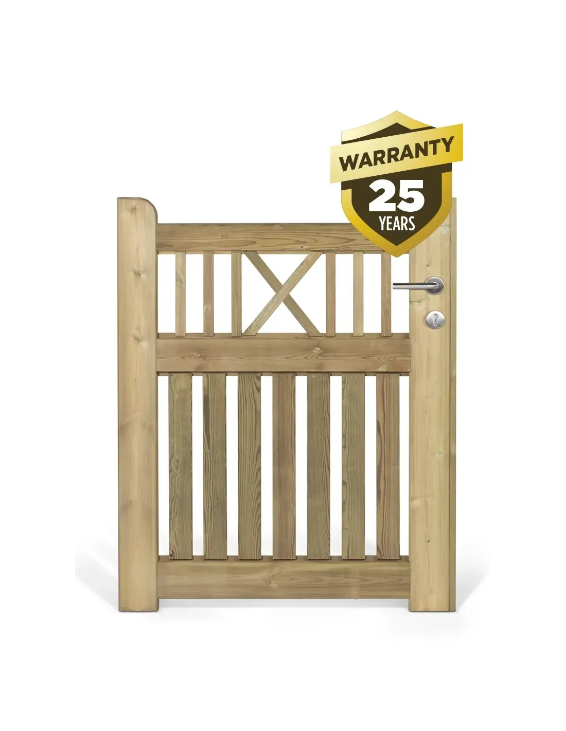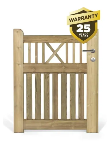 Optimisez l'entrée de votre jardin avec la porte extérieure de jardin Vivaldi, fusion parfaite de robustesse et de design esthétique. Cette porte, habillée de croix ornementales et de lattes verticales, offre une allure élégante et sophistiquée. Pour ceux qui préfèrent une entrée plus large, le portail double Vivaldi est également disponible, permettant une harmonie et une symétrie parfaites pour votre espace extérieur.