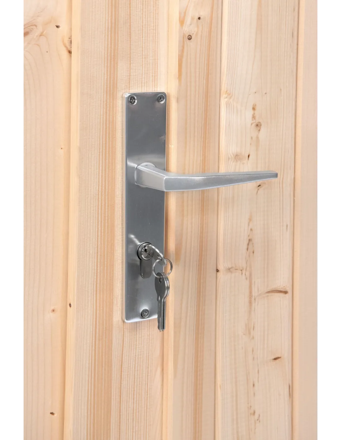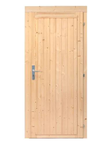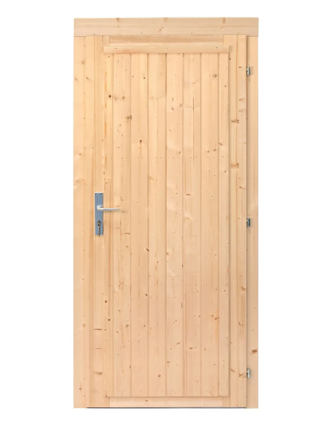 Porte simple et pleine pour abri de jardin. Elles est disponible avec une ouverture gauche ou droite. Cette porte est fournie avec son cadre, ferrure de porte et serrure à cylindre. La largeur de la porte est de 83 cm sur une hauteur de 190 cm.