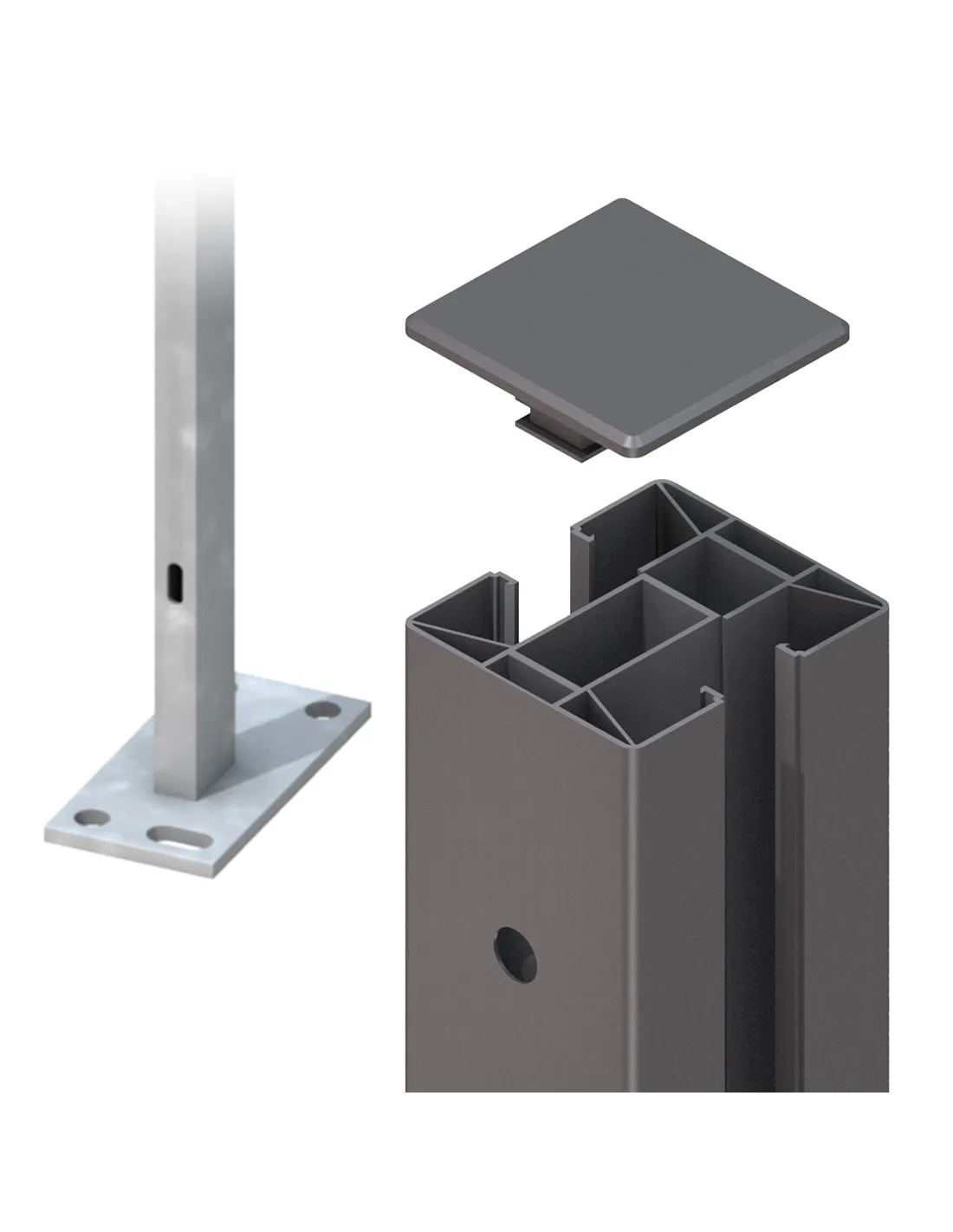Dimensions poteaux à serrage intermédiaires 7,7 x 7,4-8,4 cm. Poteaux d’angle à serrage 6,6 x 6,6 cm pour angles de 90°.