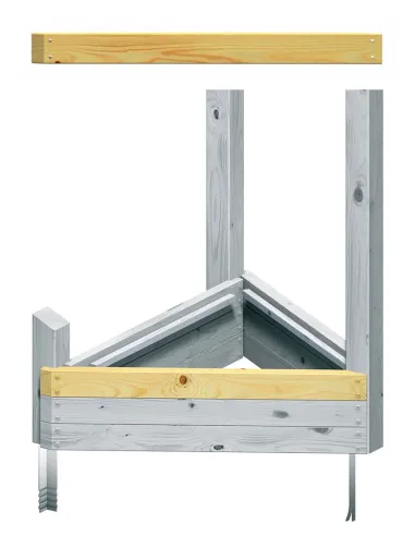 Les poutres biseautées permettent de construire des bacs à sable sous le bateau de pirate. Une hauteur de bac à sable d’env. 26 cm est recommandée. Pour cela 3 hauteurs de poutres système. Pour un remplissage aux 2/3, prévoyez env. 0,07 m3 ou 105 kg de sable.