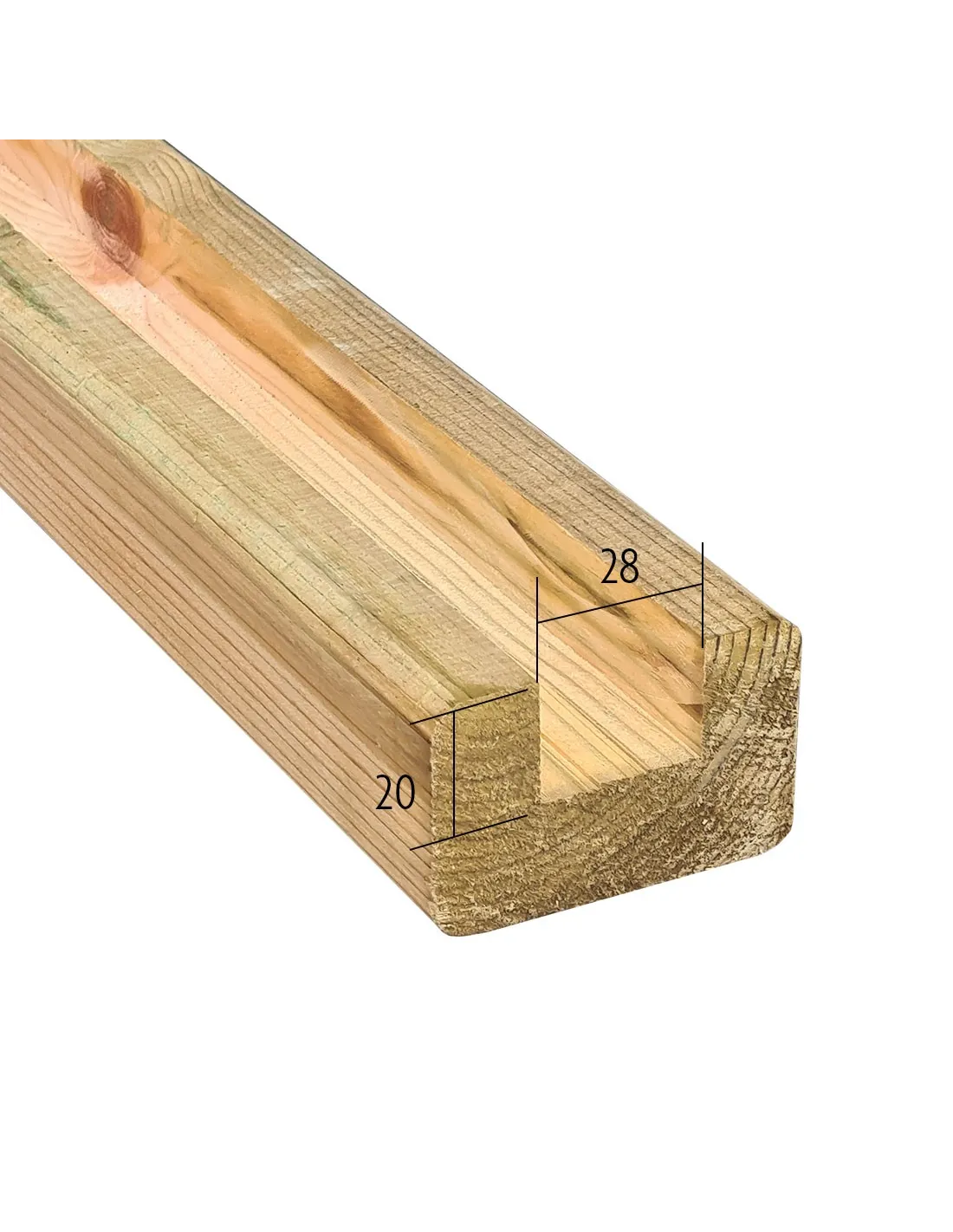 Profil de bardage en U 45x70 mm de 360 cm de long et en sapin rainuré de 28 mm.