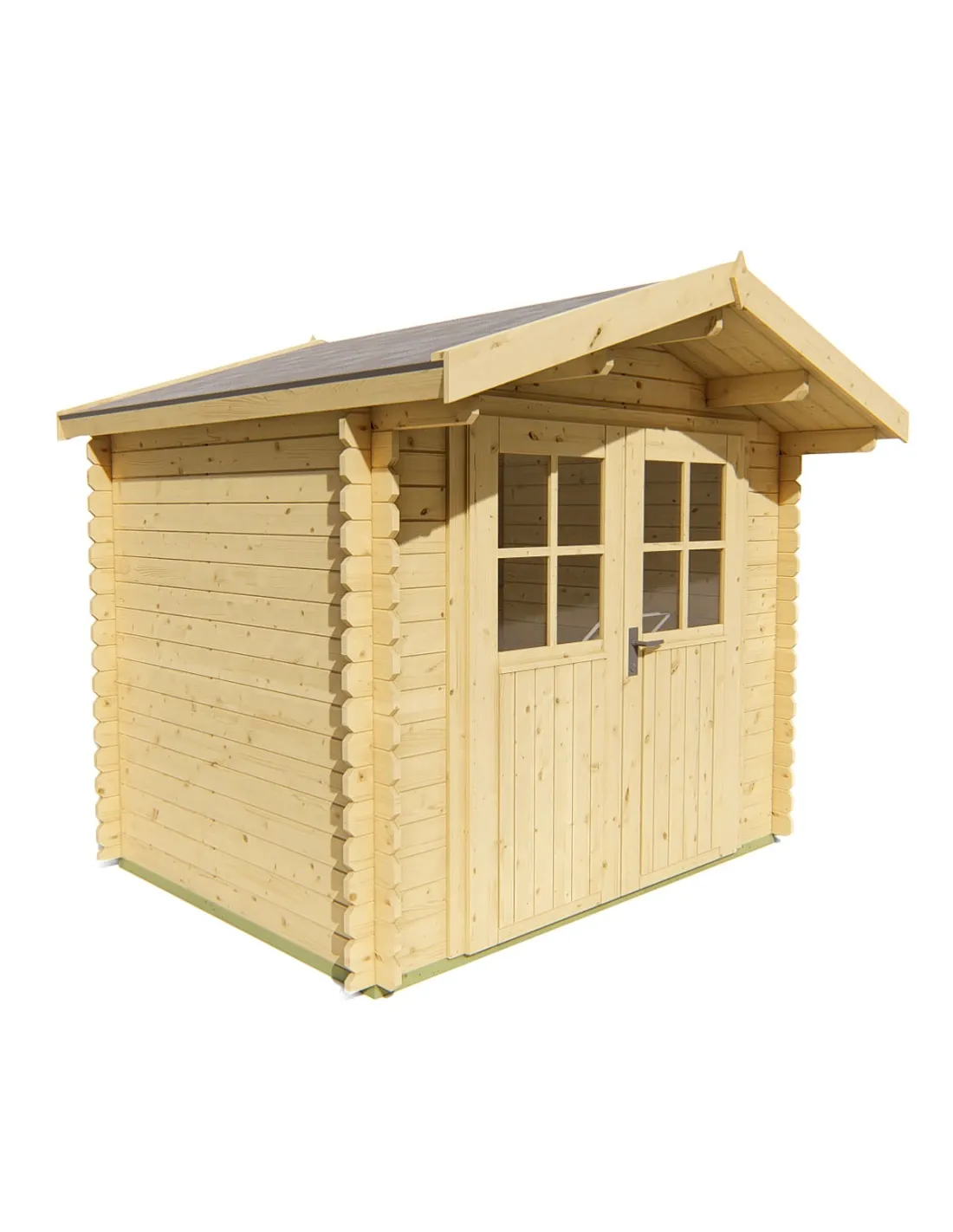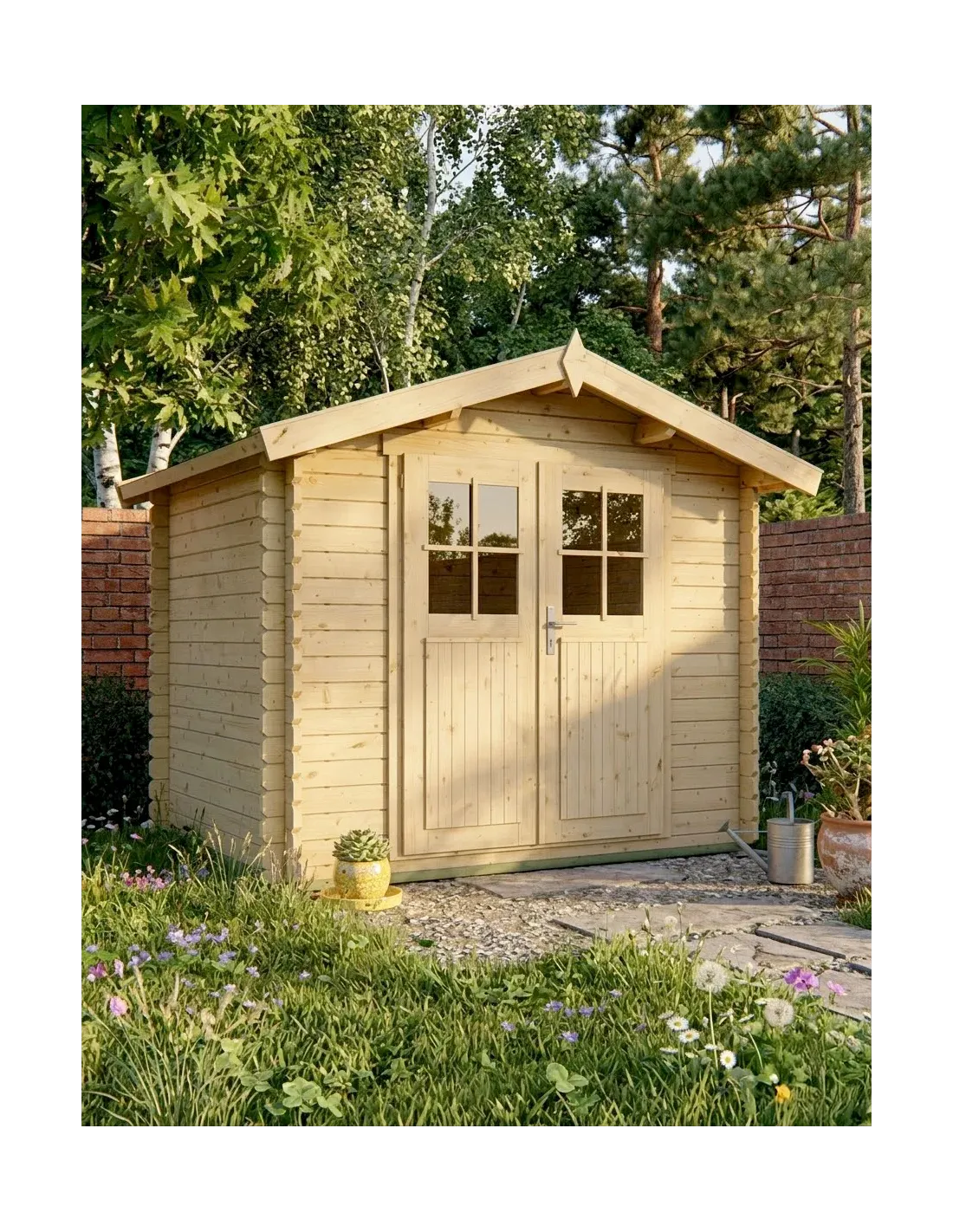 Avec une largeur de 2,60 mètres, une profondeur de 2,30 mètres et une hauteur au faîtage de 2,25 mètres, cet abri compact s'intègre facilement dans tout type de jardin. Sa structure en bois massif de 28 mm d’épaisseur assure robustesse et durabilité.