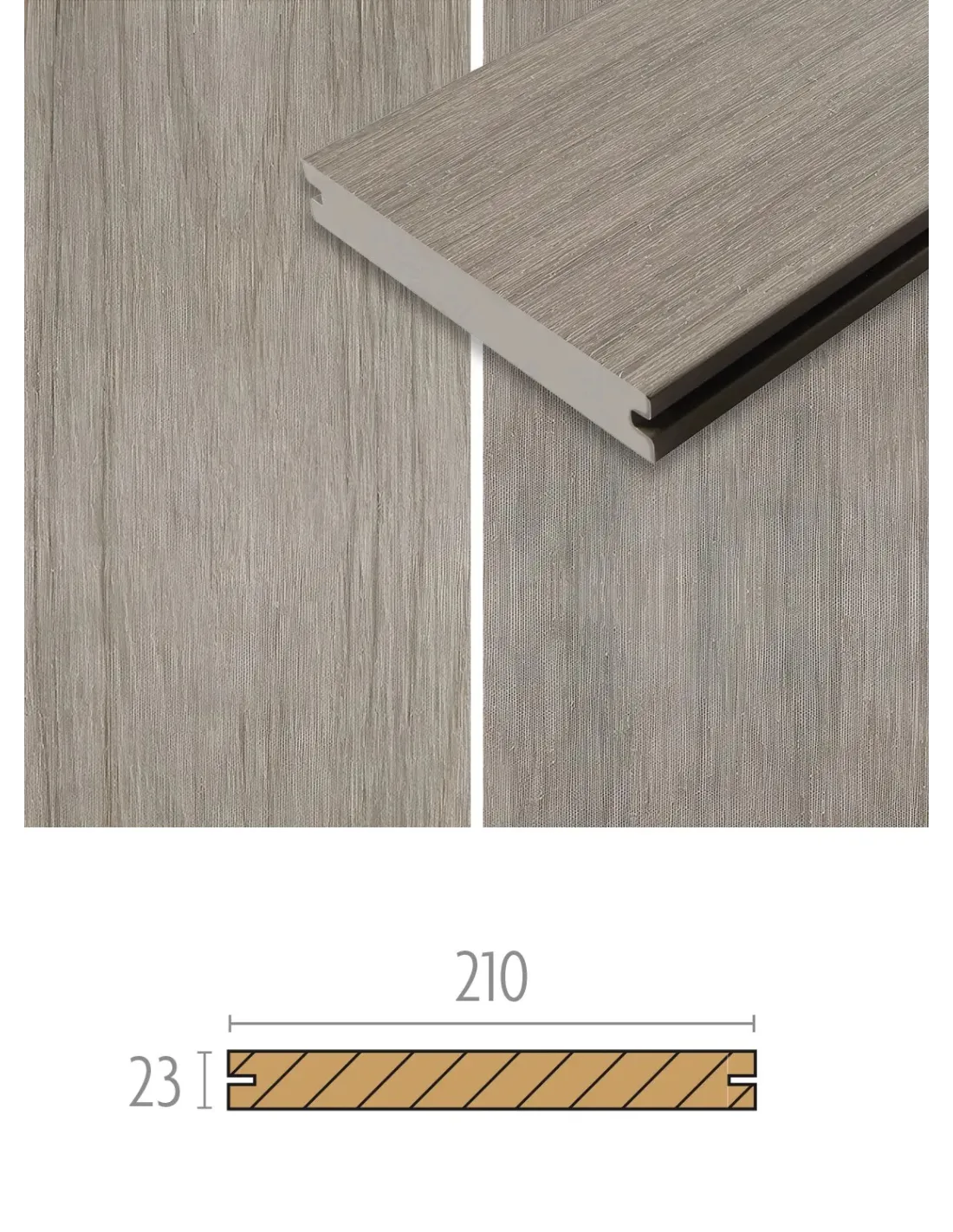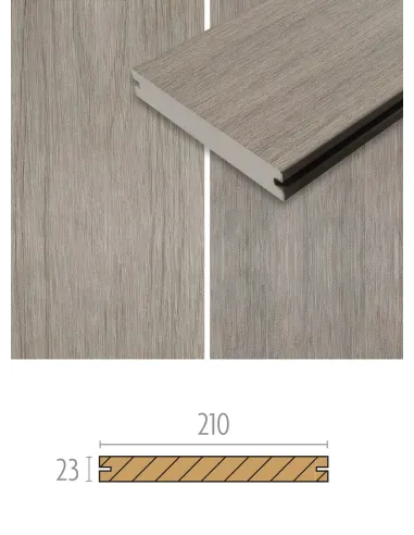 Les lames de terrasse en bois composite Multigrey Light ont les deux faces différentes avec une imitation de nervure de bois ce qui lui donne plus de relief et lisse. Les planches de bois composite mesurent 2,3 cm sur 21 cm pour une longueur de 4 mètres. Sa couleur est grise légèrement boisée. Elles se fixent avec des clips Cobra hybride.