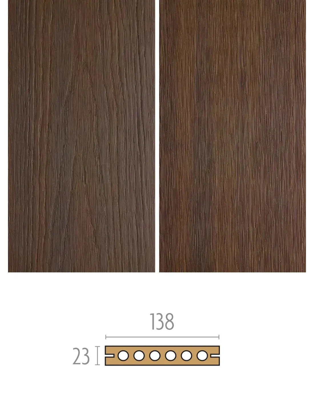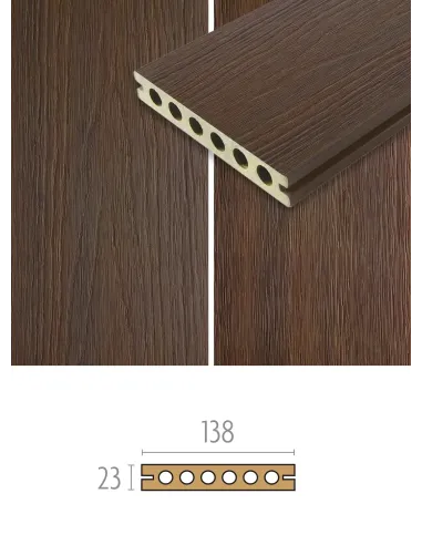 En provenance de Chine, ces lames de terrasse en bois synthétiques sont lisses et mesurent 138x23mm. Les planches en bois composite sont disponibles en 2 coloris : brun ou gris cendré. Elles se fixent sur des lambourdes à l’aide clips appelé Cobra hybride.
